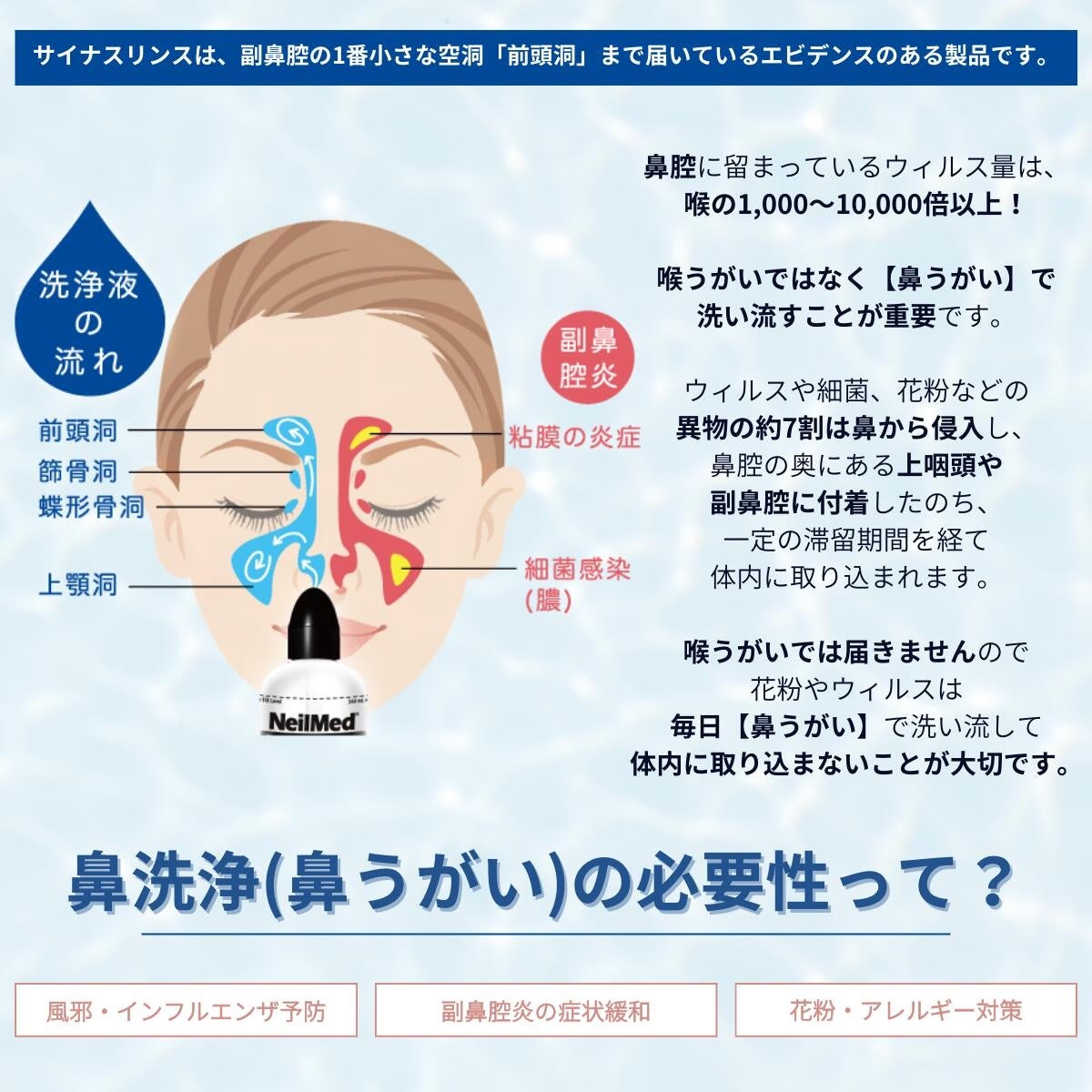 ※鼻うがいは副鼻腔・上咽頭に付着しているウィルス、花粉、最近などの異物を洗い流すことを目的としており、風邪やインフルエンザの予防、治療を保障するものではありません。