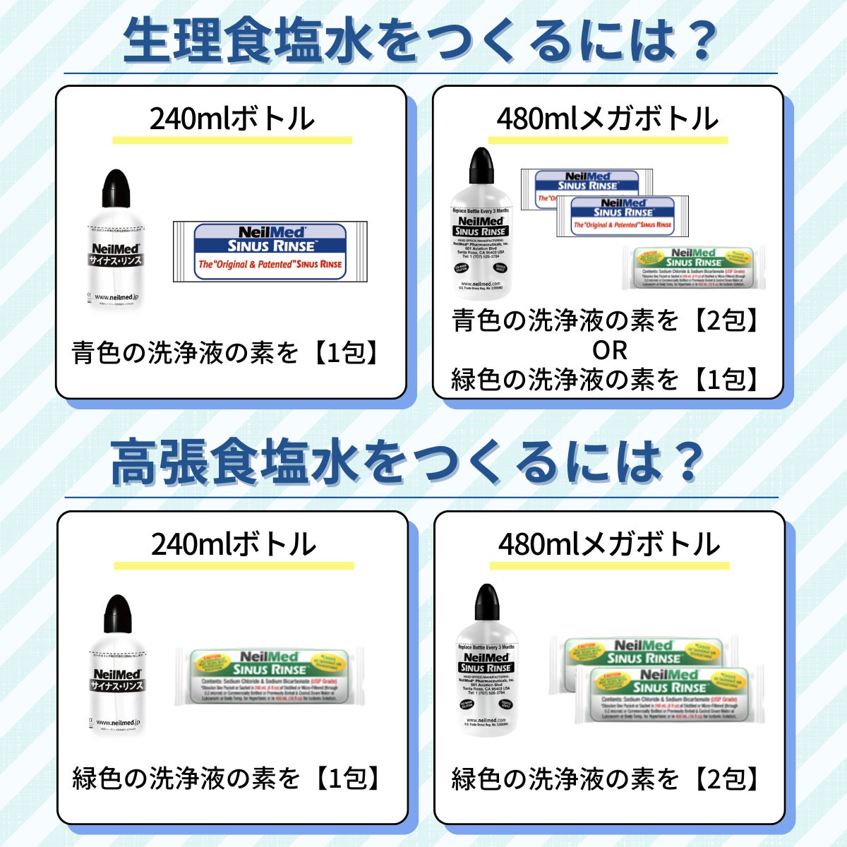 ・サイナスリンス 480㎖メガボトルでは塩濃度0.9%の生理食塩水に