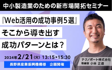 製造業向けのWebマーケティングサービスを提供する、テクノポート株式会社(本社:東京都港区、代表取締役:徳山 正康)は、長野県内の中小製造業の新市場開拓を支援することを目的に、長野産業振興機構が2024年2月21日(水)に主催する新市場開拓セミナーに登壇します。