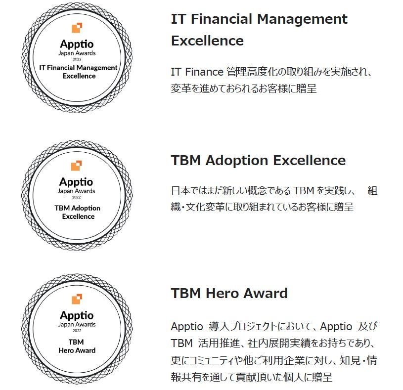 「Apptio Japan Awards」は、ApptioおよびTBMの先進的な実践や取組みをされている国内のお客様を表彰するものです。2022年度は以下3つのカテゴリーで、計4社1名のお客様にアワードを贈呈いたしました。