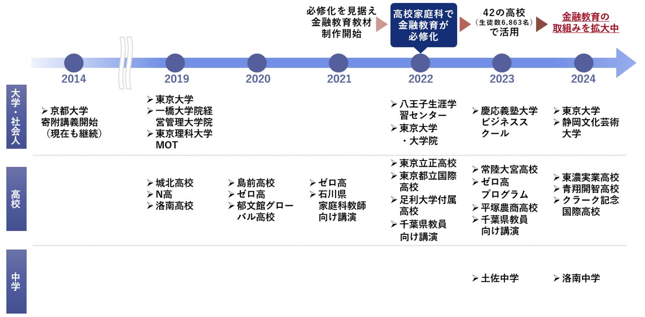 2022年4月から高校家庭科の授業で金融教育が必修化されるのにあわせ、国内最大の教員向けオンラインプラットフォーム「SENSEIノート」を開発・運営しているARROWS社と提携し、金融教育授業教材を開発。2022年3月より全国の高校を対象に無償提供を開始している他、出前授業も実施。