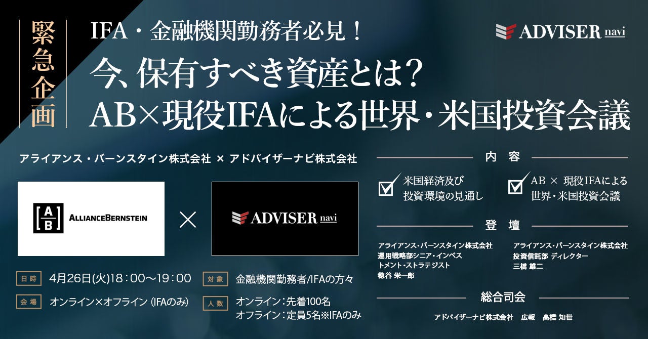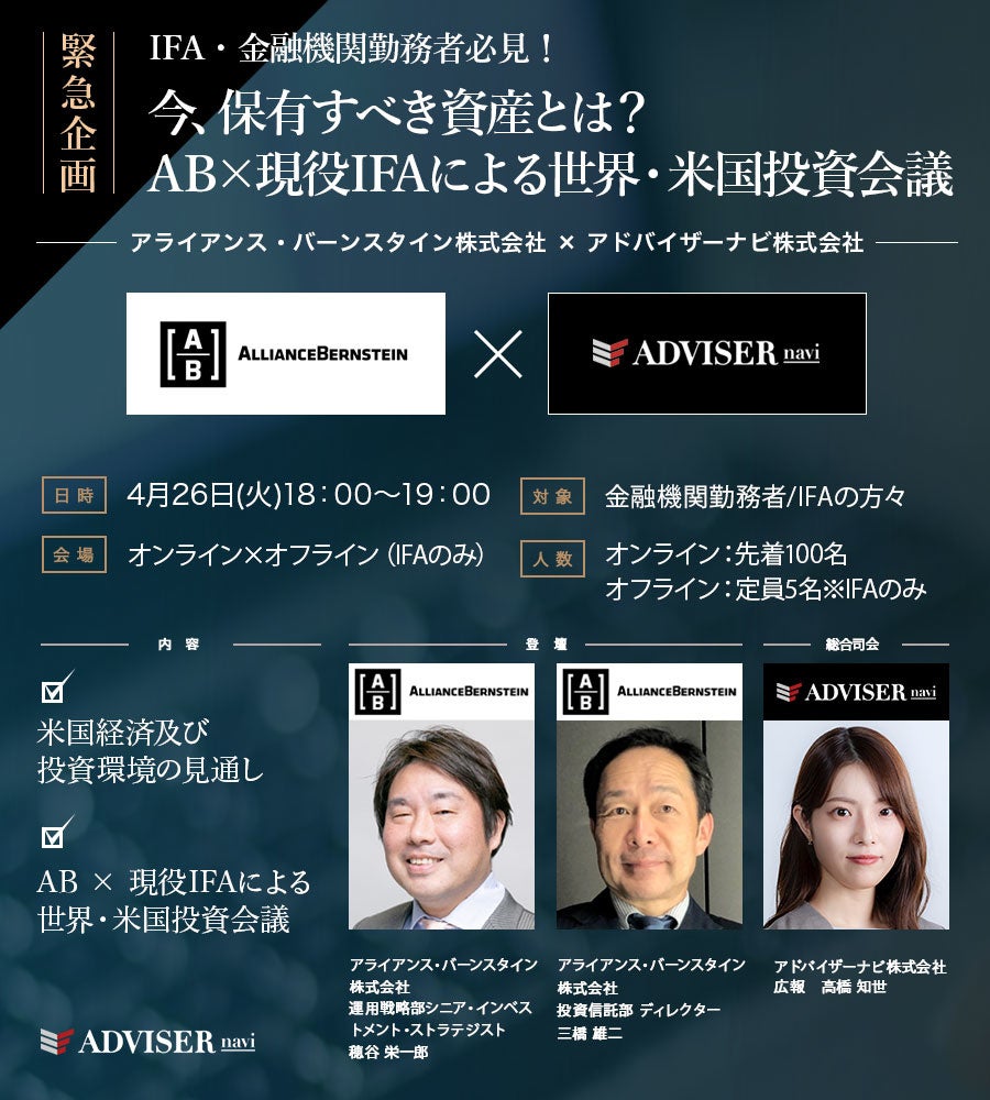 IFA総合コンサルティングファーム『アドバイザーナビ』主催、『アライアンス・バーンスタイン』協力によるIFA/金融機関勤務者向けウェビナーが2022年4月26日(火)18:00〜開催いたします。