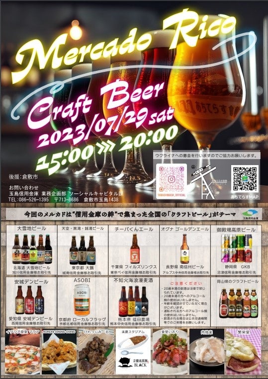 玉島信用金庫(岡山県倉敷市/理事長宅和博彦)は、2023/7/29(土)15:00~20:00、あちてらす倉敷オープンスペースにてMercadoRico(たましん主催のマルシェ)を開催します。今回のテーマは、「クラフトビール」。信用金庫の絆で集まった全国のクラフトビールと当金庫お取引先のビールにあうおつまみをお楽しみください。