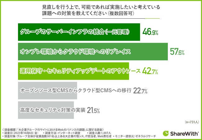 次に、『見直しの必要がある(1~2年以内に着手する)』『見直しの必要がある(これから計画する)』と回答した方に、「見直しを行う上で、可能であれば実施したいと考えている課題への対策を教えてください(複数回答可)」と質問したところ、『オンプレ環境からクラウド環境へのリプレイス(57.6%)』と回答した方が最も多く、次いで『グループのサーバーインフラの統合(一元管理)(46.9%)』『運用保守・セキュリティアップデートのアウトソース(42.7%)』と続き、オンプレ環境からクラウド環境へのリプレイスを実現したい方が半数以上であること、そして、サーバーインフラの統合を実施したいと思う方も多くいることが判明しました。
