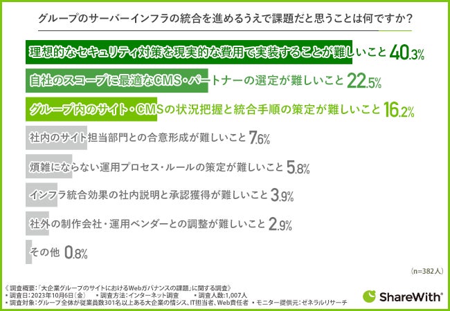 最後に、先程の質問で『グループのサーバーインフラの統合(一元管理)』と回答した方に「グループのサーバーインフラの統合を進めるうえで課題だと思うことは何ですか?」と質問したところ、『理想的なセキュリティ対策を現実的な費用で実装することが難しいこと(40.3%)』と回答した方が最も多く、次いで『自社のスコープに最適なCMS・パートナーの選定が難しいこと(22.5%)』『グループ内のサイト・CMSの状況把握と統合手順の策定が難しいこと(16.2%)』と続いています。特にセキュリティについては、IT部門における必要な基準を満たすにはコスト負担の大きさが壁となっている現実が浮かび上がりました。