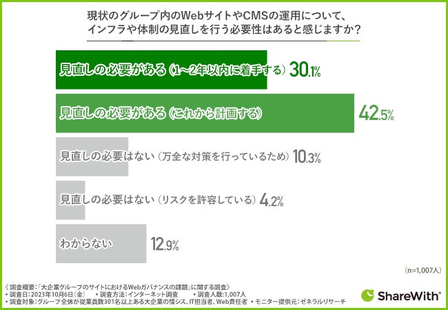 大企業のIT担当者・Web責任者の74.6%が、グループ内のWebサイトやCMSの運用体制の見直しが必要だと感じている。そのうち30.1%が「2年以内に着手」と回答