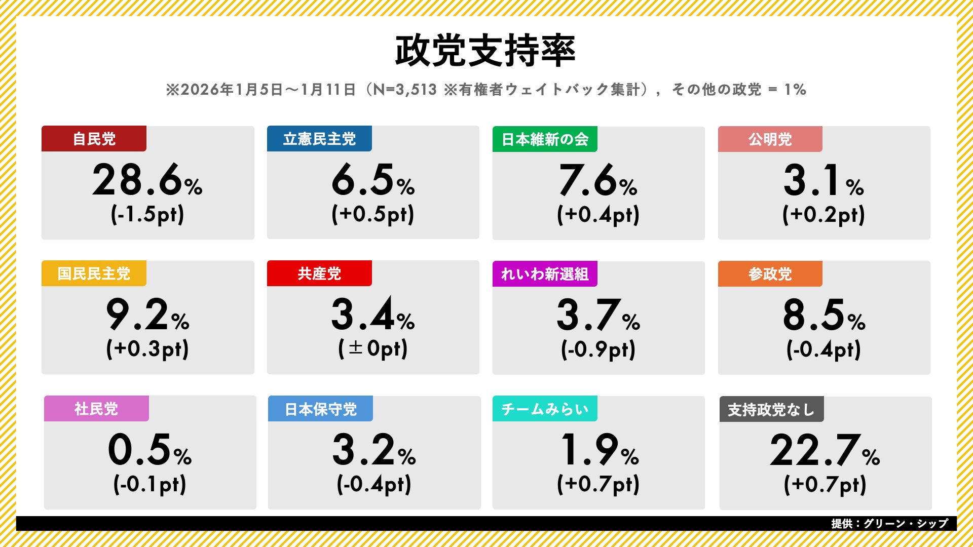 ジャッグジャパン株式会社(本社:東京都渋谷区)は、株式会社グリーン・シップ(本社:東京都千代田区)と業務提携し、グリーン・シップが提供する日次世論調査「世論レーダー」のデータを提供しております。本日、2026年1月第2週(1月5日〜1月11日)の内閣支持率・政党支持率調査の結果を発表いたします。