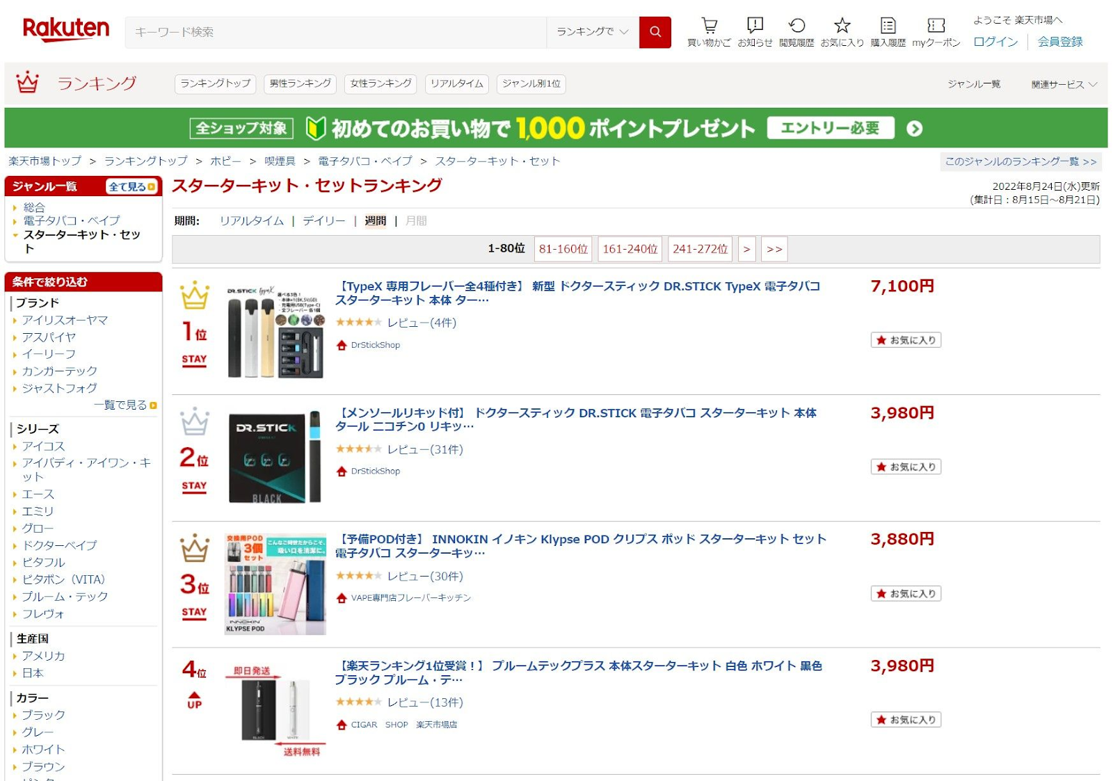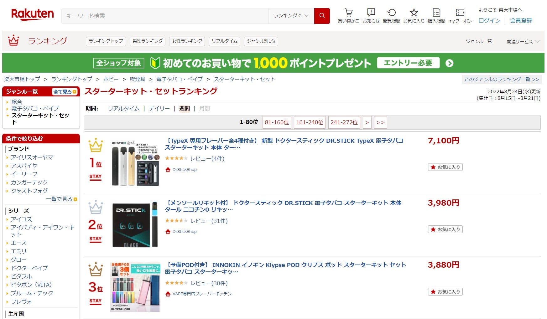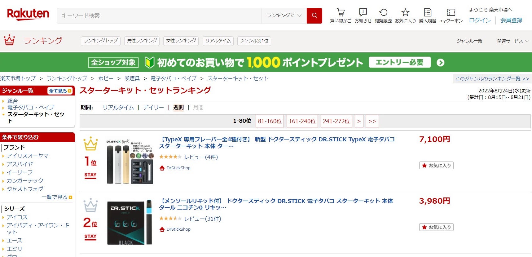 ※楽天市場 スターターキット・セットランキング1位、2位(ウィークリー)