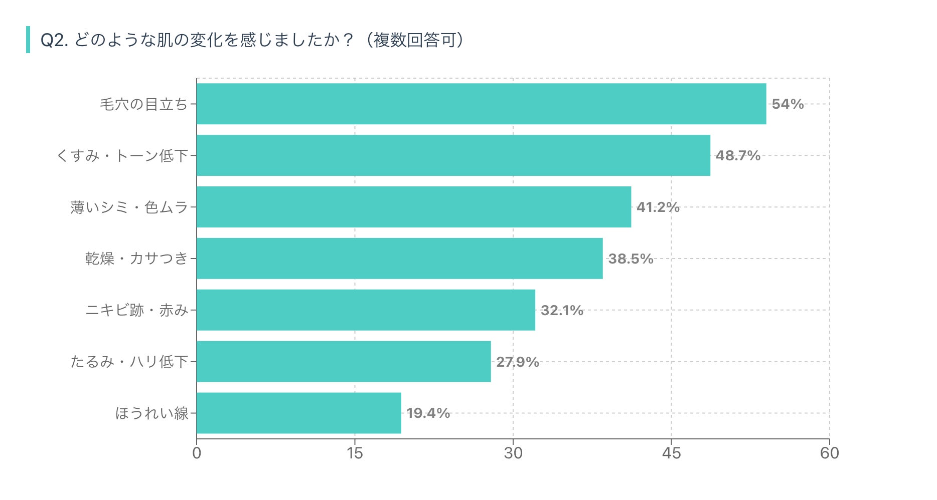 ■最も多い変化は「毛穴の目立ち」で約54%、次いで「くすみ」「シミ・色ムラ」