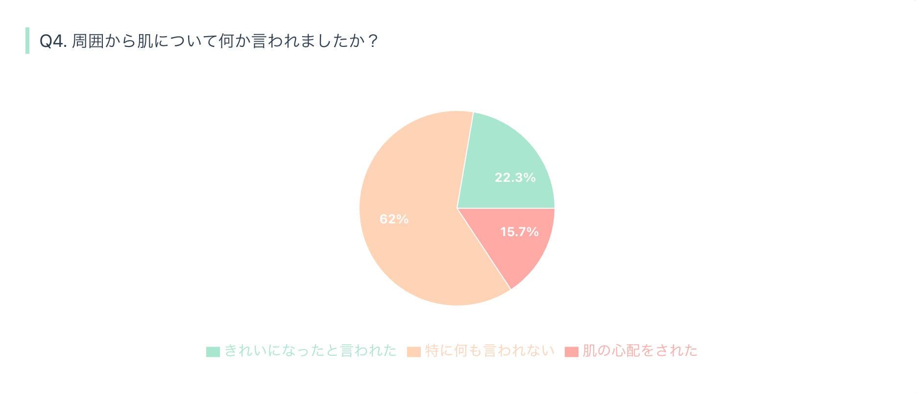 肌がきれいになったと言われた: 22.3% 特に何も言われない: 62.0% 肌の心配をされた: 15.7%