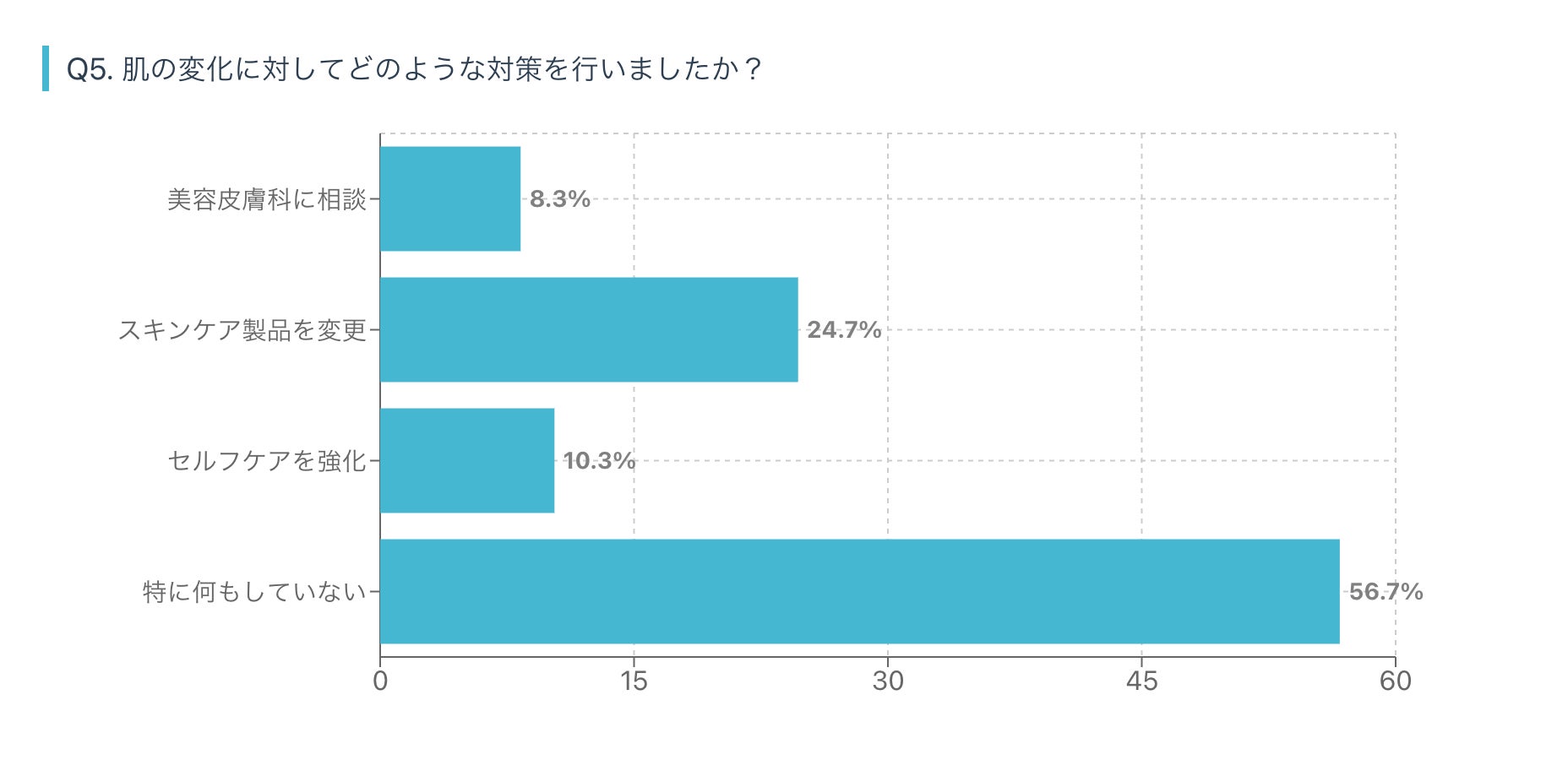 その結果、何らかの対策を行った方は約43%にとどまり、半数以上の方が肌の変化に気づきながらも適切な対処をしていない実態が明らかになりました。