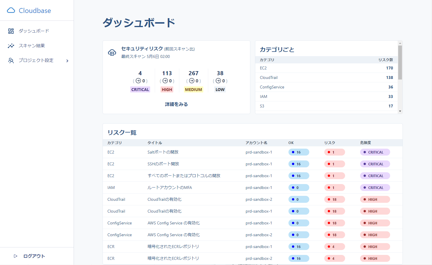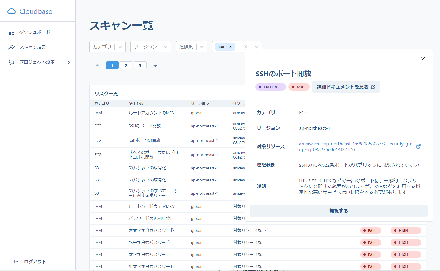 「Cloudbase」では、危険度順に設定ミスを確認することができるため、リスクの高いものから対処することが可能です。