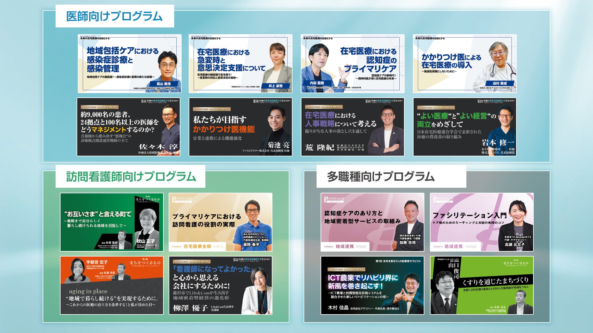 本動画サービスでは、在宅医療に携わる各専門職のトップランナーによるセミナーやトークライブ等を続々開催しています。 常に新鮮な情報に出会えるだけでなく、明日からすぐに活かせるノウハウに触れ、自らの医療知識やスキルをアップデートし続けることができます。 会員数3,000人突破記念として、今後は全てのプログラムの一部を無料でご覧いただけるようになりました。
