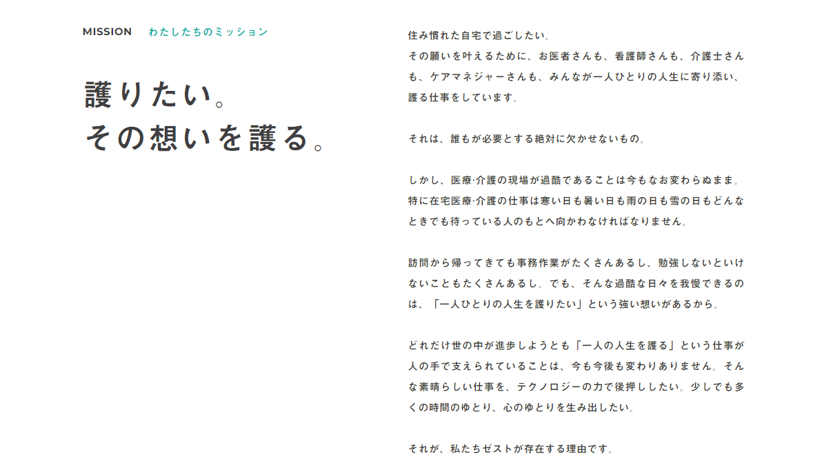 これまではプロダクトサイトが中心であり、コーポレート部分は会社概要のみの展開でした。お客様はもちろん、関係各社様、採用候補者様、投資家様に対し、プロダクトの便益をお伝えするだけでは十分ではないと考えコーポレートサイトの公開を目指しました。どのような想いを持って、どのような価値提供を目指し、社員1人1人が在宅医療・介護業界に向き合っているのかを知っていただくことも重要であると考え、ミッション・ビジョン・バリューを丁寧にお伝えすることが出来る形としています。