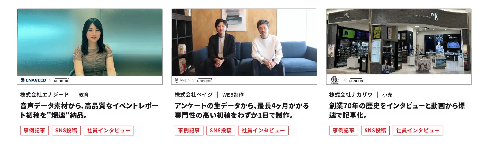 マーケティングの側面から、企業の事業成長と生産性向上を支援する株式会社unname(本社:東京都渋谷区、代表取締役:宮脇 啓輔、以下「unname」)は、生成AIを活用したコンテンツ制作サービス「爆速AIライティング」の提供を11月13日(木)より開始しましたことをお知らせします。unnameは最新のAI技術とコンサルタントのマーケティング知識を組み合わせ、マーケティング・広報・採用などの目的に合わせたコンテンツを爆速で制作し、企業のコンテンツマーケティング強化をご支援いたします。