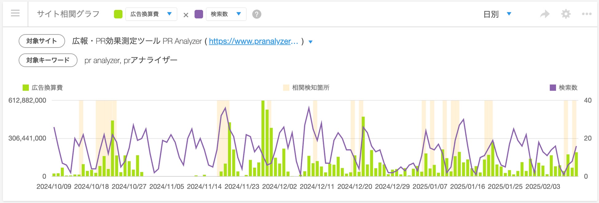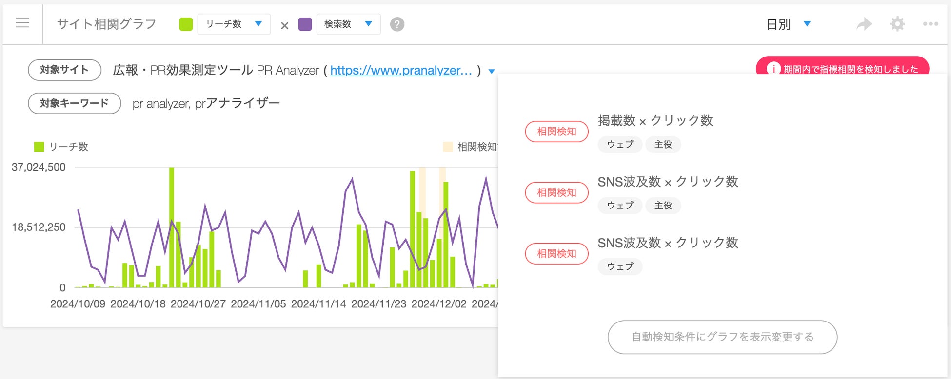 記事データとWebアクセスデータが同じタイミングで上昇している場合、自動的にグラフ上でハイライトしてお知らせします。