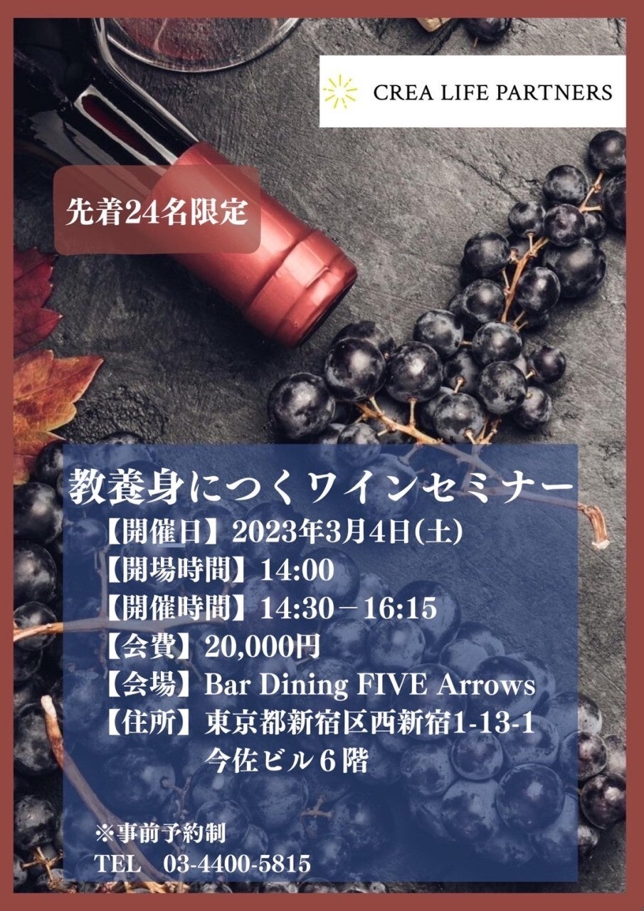 株式会社クレア・ライフ・パートナーズ(本社:東京都新宿区、代表取締役社長:工藤 将太郎)は、3 月 4 日(土)に東京・新宿のダイニングバーBarFiveArrows を会場として、ワインセミナーを開催いたします。このセミナーは、実際にワインを試飲しながら、ワインの基礎知識から知っていれば得をする応用編までを贅沢に学べる企画になっています。