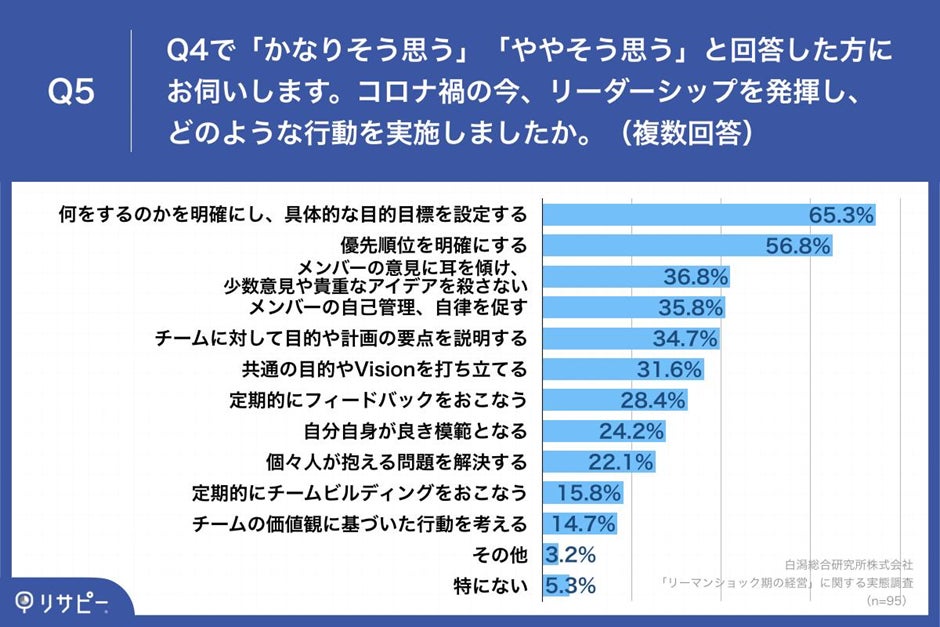 また、コロナ禍の今、88.0%の経営者がリーダーシップの重要性の高まりを実感していることが分かりました。このコロナ禍でリーダーシップを発揮した行動を伺うと、リーマンショック後と同様に、「具体的な目的目標を設定」(65.3%)や「優先順位の明確化」(56.8%)を実施したことが判明しました。他にも「到達可能な目標を協同で掲げた」や、「対面ではなくリモートでできる方策の検討・実施」などの行動を実施した経営者もいました。