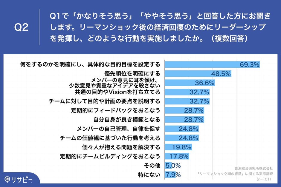 - リーマンショック後のリーダーシップを発揮した行動、「何をするのかを明確にし、具体的な目的目標を設定する」が69.3%で最多