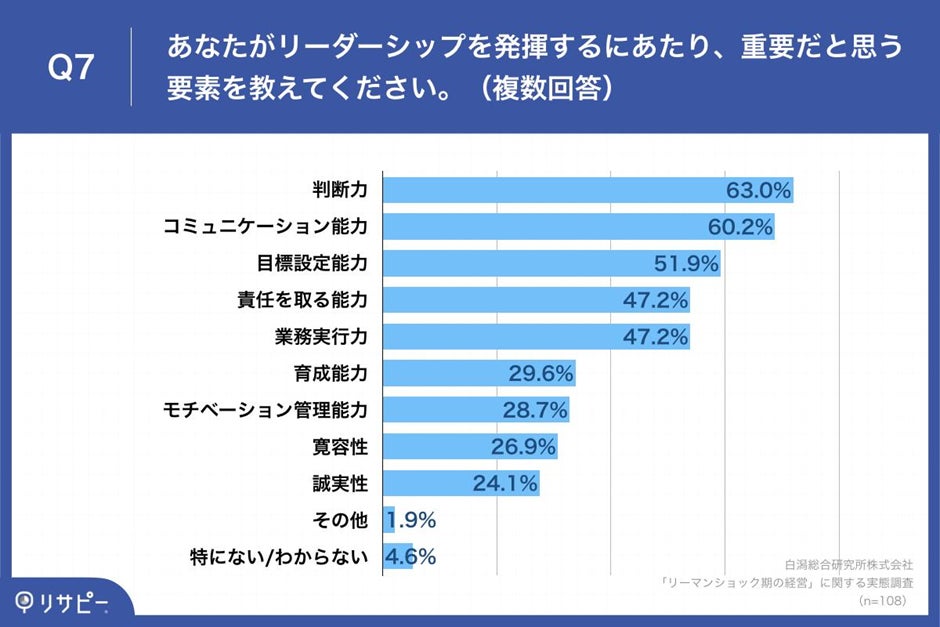 - リーダーシップを発揮するための重要な要素、「判断力」(63.0%)や「コミュニケーション能力」(60.2%)の声