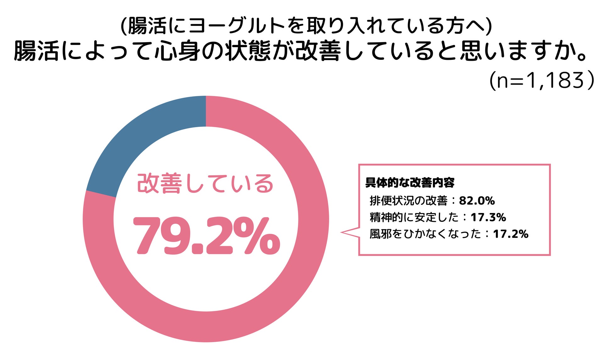 腸活のためにヨーグルトを取り入れている人の79.2%が、なんらかの心身の改善効果を実感していると回答しました。具体的な内容では、82.0%が排便状況の改善を実感。そのほか、精神的に安定した、風邪をひかなくなったなどの効果を実感しているという回答も多く見られました。