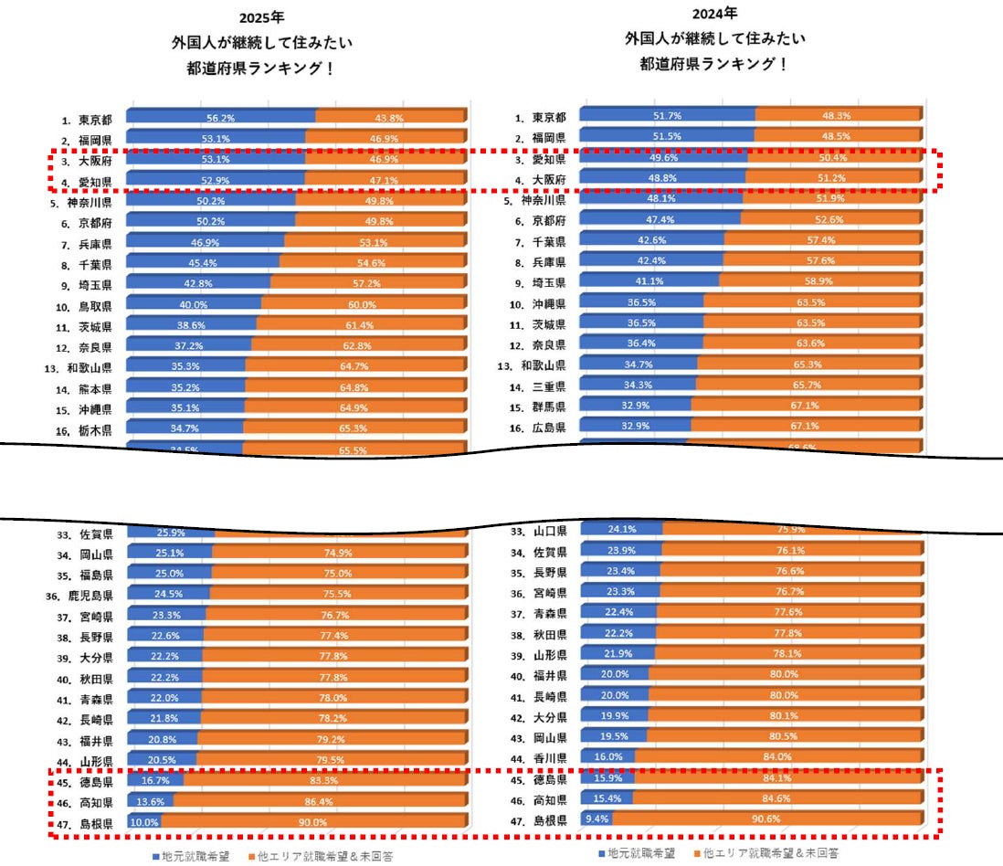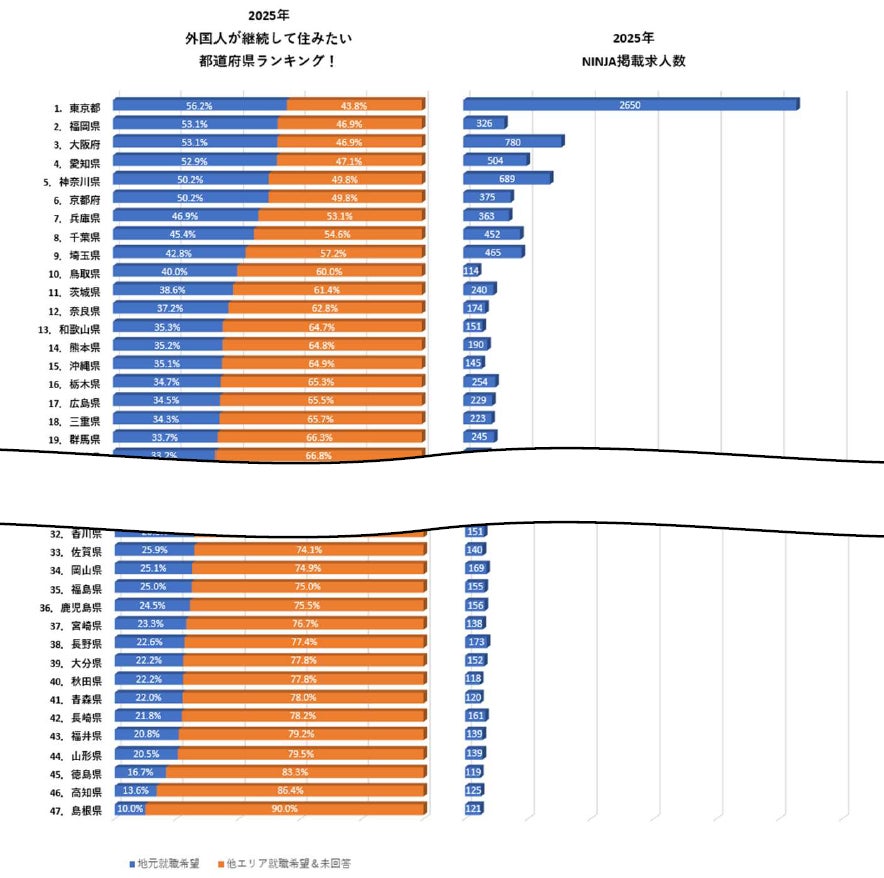 外国人のための就職・転職情報サイトNINJA(以下「NINJA」)を運営する 株式会社グローバルパワー(本社:東京都台東区 代表取締役社長 竹内 幸一)は、「外国人が継続して住みたいと思う都道府県」ランキングの2025年版を発表しました。本調査は2024年に続く第2回目の実施となります。