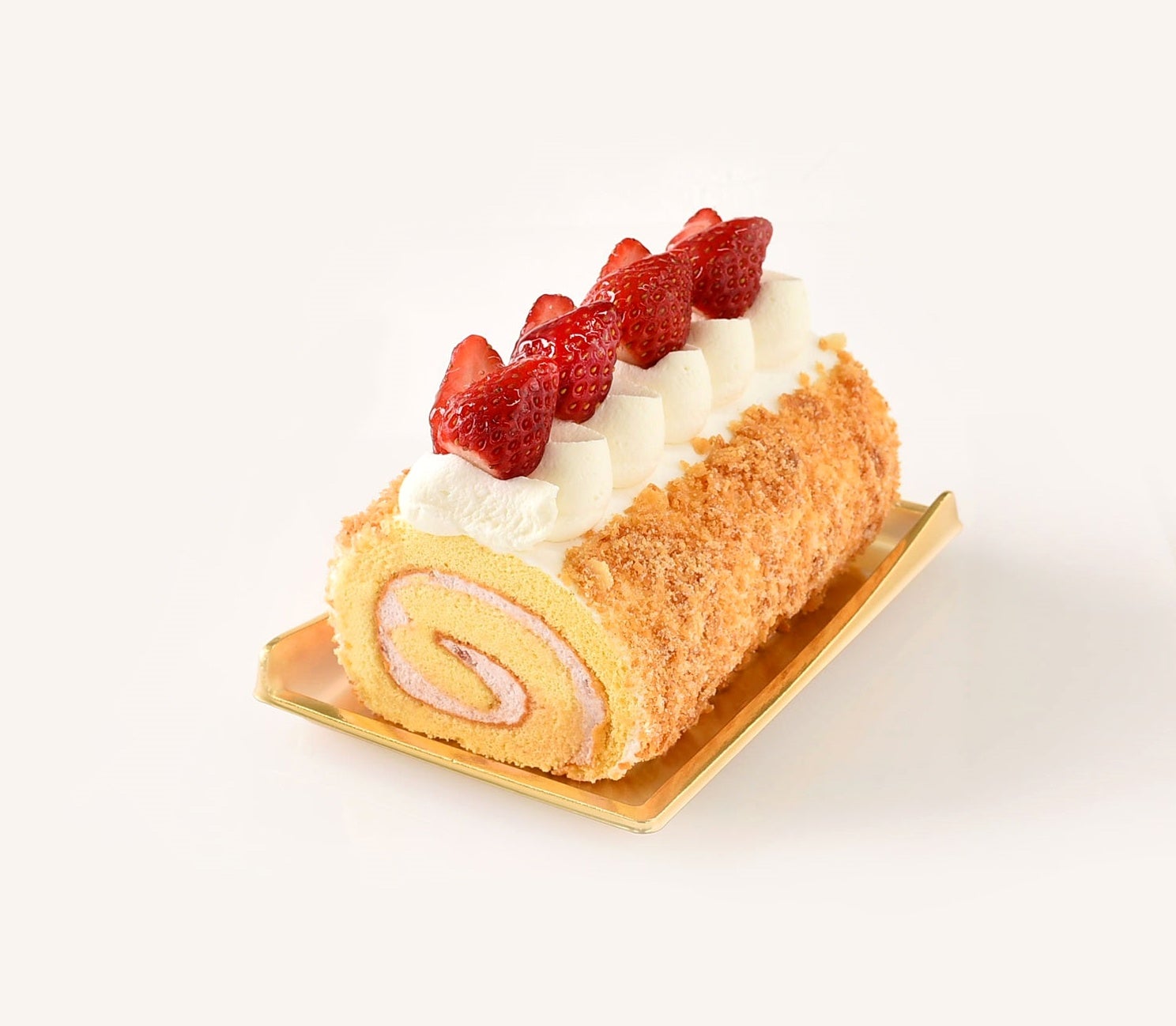 果肉が入った苺クリームを、バニラの風味が香るしっとり食感のロール生地で丁寧に巻きあげました。甘酸っぱい苺クリームとロール生地の優しい味わいをお楽しみください。