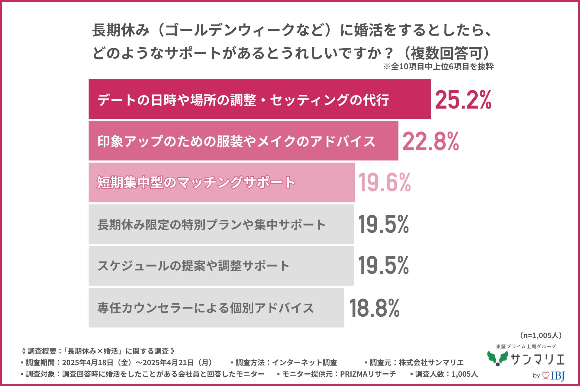 「長期休み(ゴールデンウィークなど)に婚活をするとしたら、どのようなサポートがあるとうれしいか」と尋ねたところ、『デートの日時や場所の調整・セッティングの代行(25.2%)』『印象アップのための服装やメイクのアドバイス(22.8%)』『短期集中型のマッチングサポート(19.6%)』が上位に挙がりました。