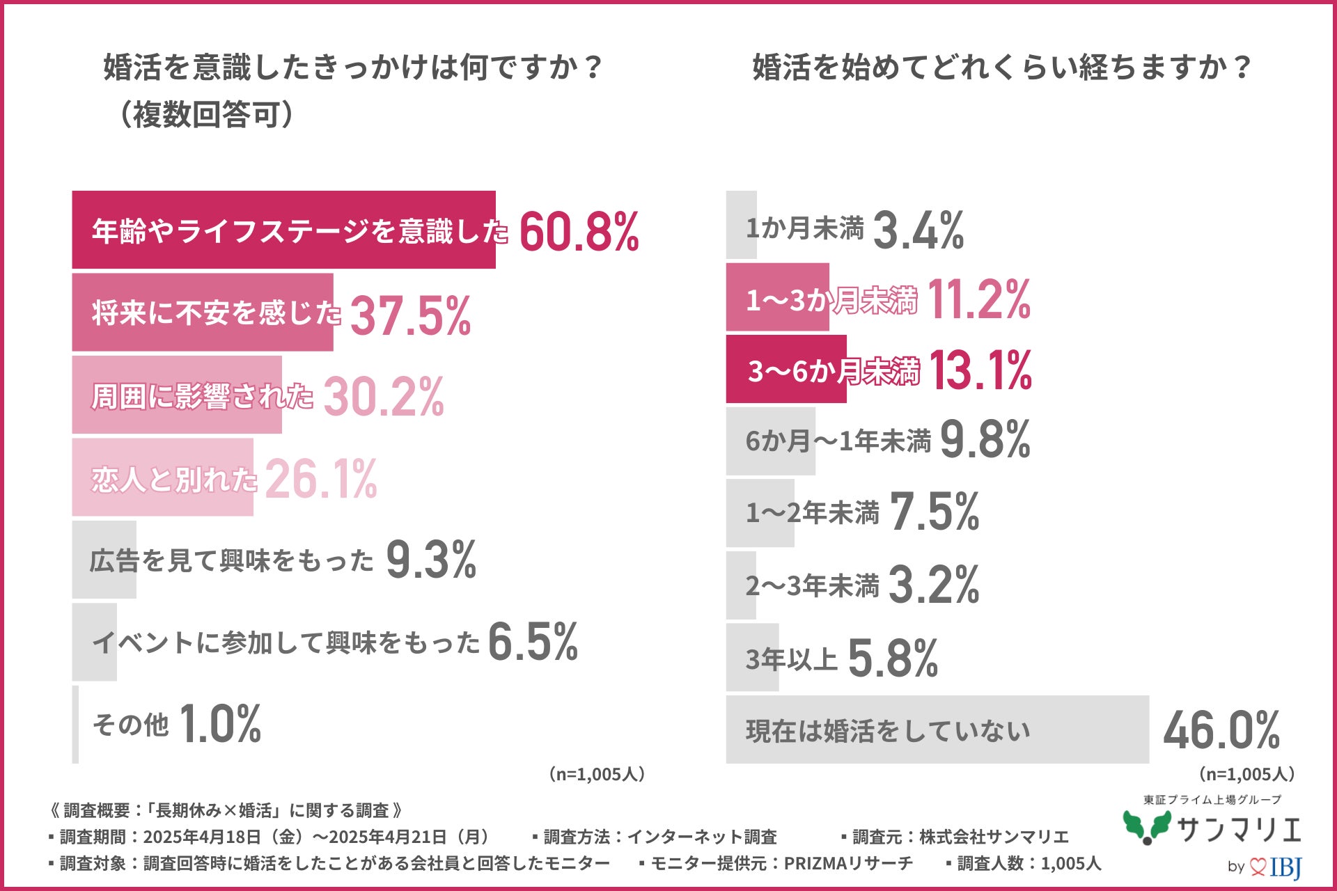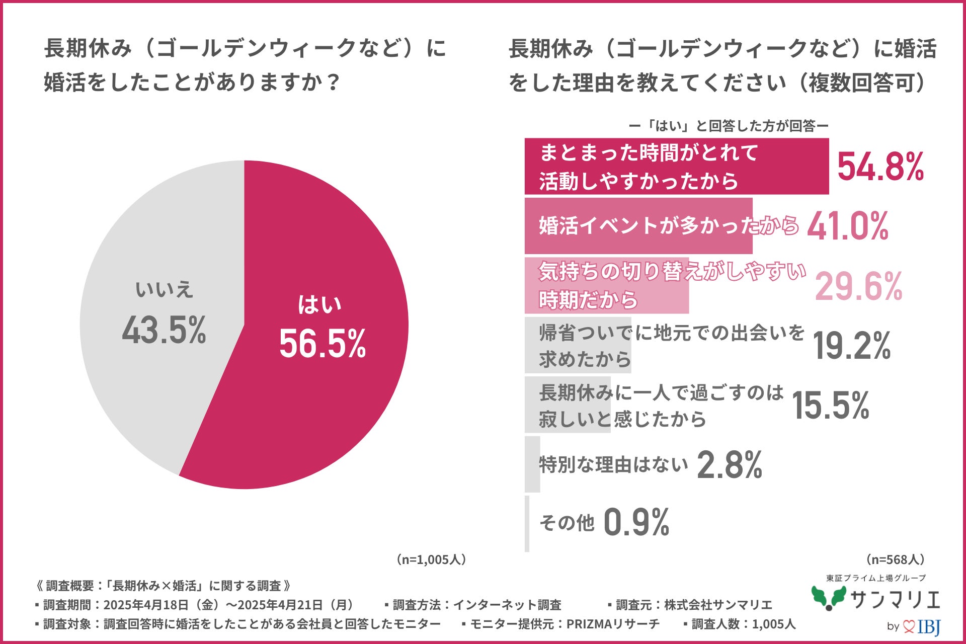 今回の調査で、ゴールデンウィークなどの長期休みが、婚活を始める・再開するきっかけとして大きな役割を果たしていることが明らかになりました。