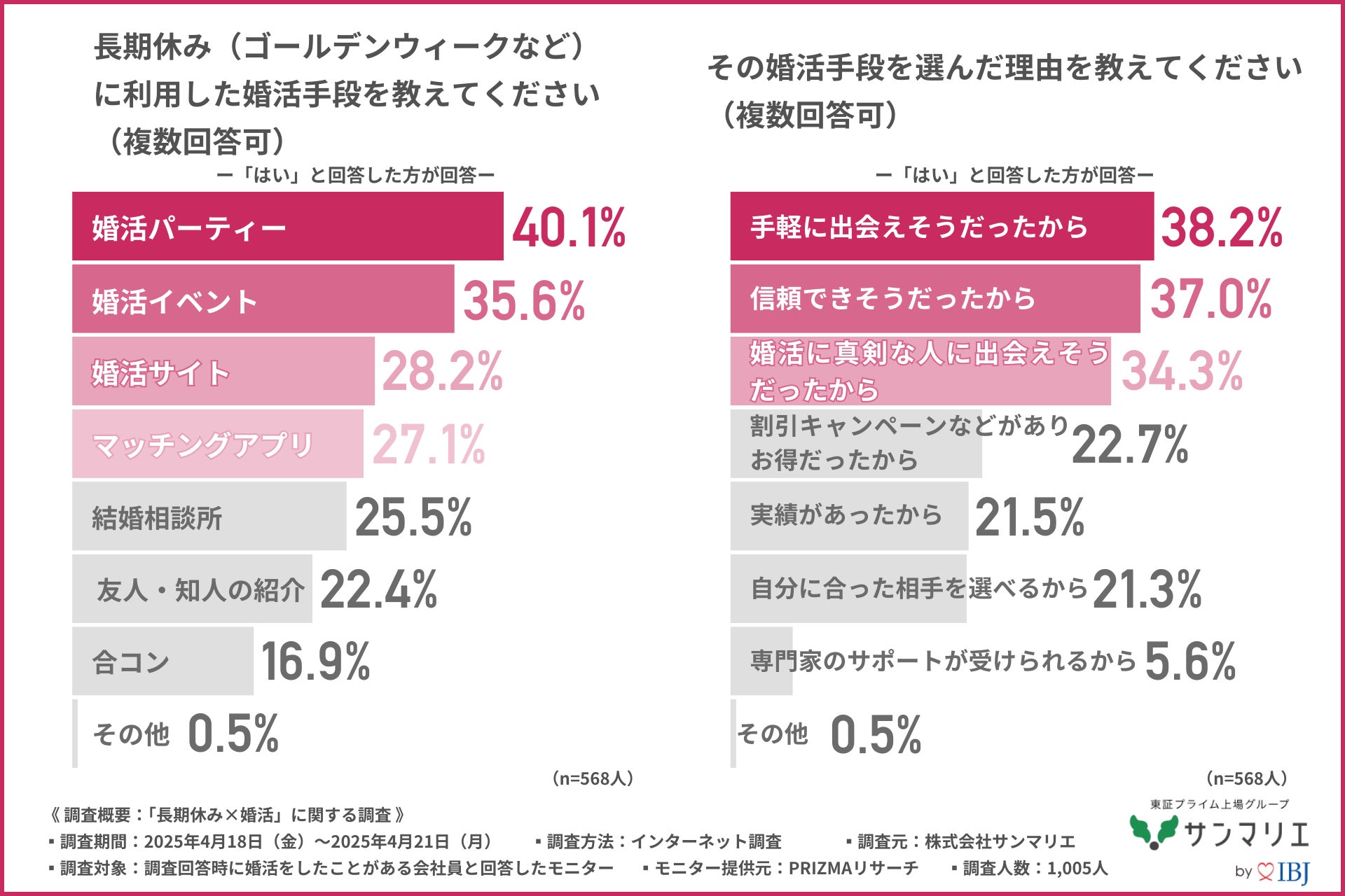 「長期休み(ゴールデンウィークなど)に利用した婚活手段」について尋ねたところ、『婚活パーティー(40.1%)』が最多で、次いで『婚活イベント(35.6%)』『婚活サイト(28.2%)』となりました。