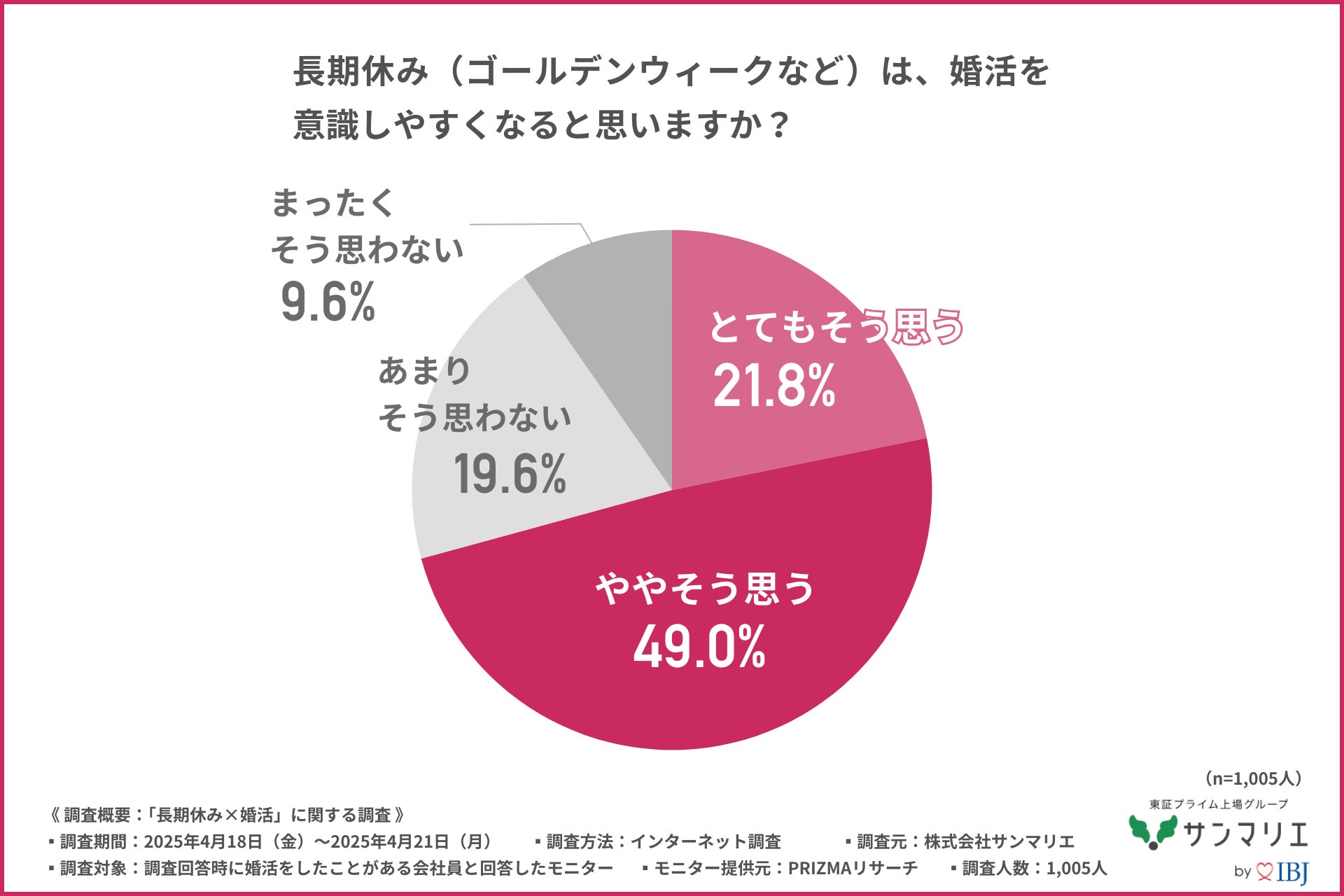 「長期休み(ゴールデンウィークなど)は、婚活を意識しやすくなるか」について尋ねたところ、約7割の方が『とてもそう思う(21.8%)』『ややそう思う(49.0%)』と回答しました。