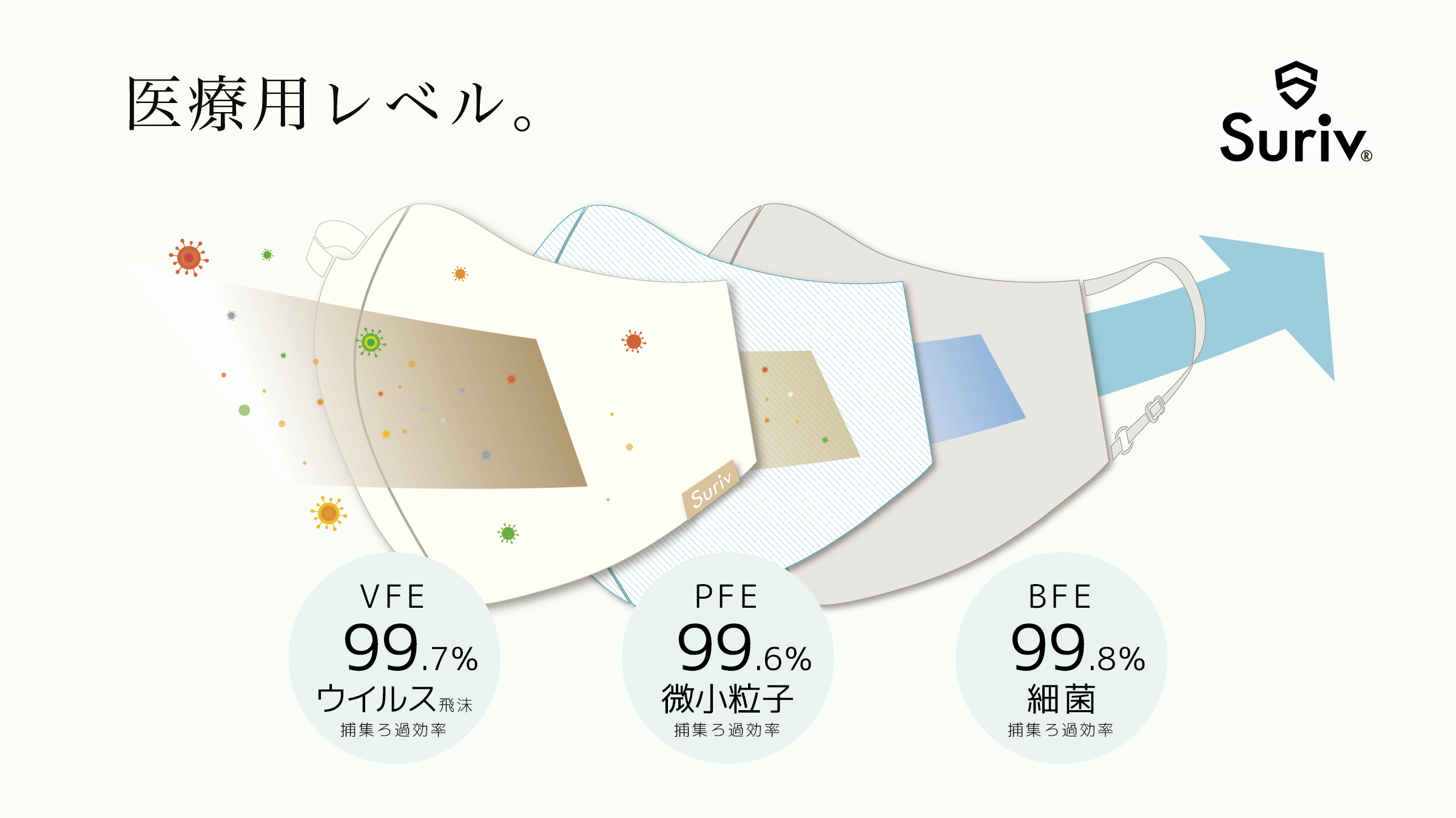 感染リスクを抑え、周囲にうつさないための基準。ウイルスの予防に望ましいとされる、PFE・VFEレベル98%以上をクリアした、高性能フィルターを搭載。