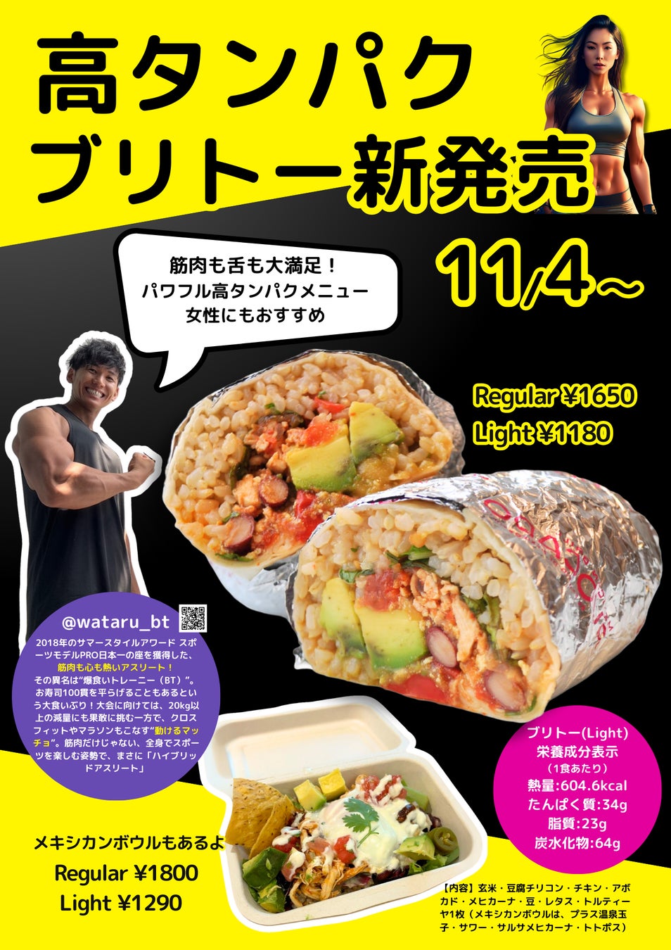 健康志向の高い方に向けた「高たんぱくブリトー」を新発売いたします。ジム利用者の方に最適な栄養価と美味しさを兼ね備えたメニューです。発売開始日は2024年11月4日(月・祝)となります。