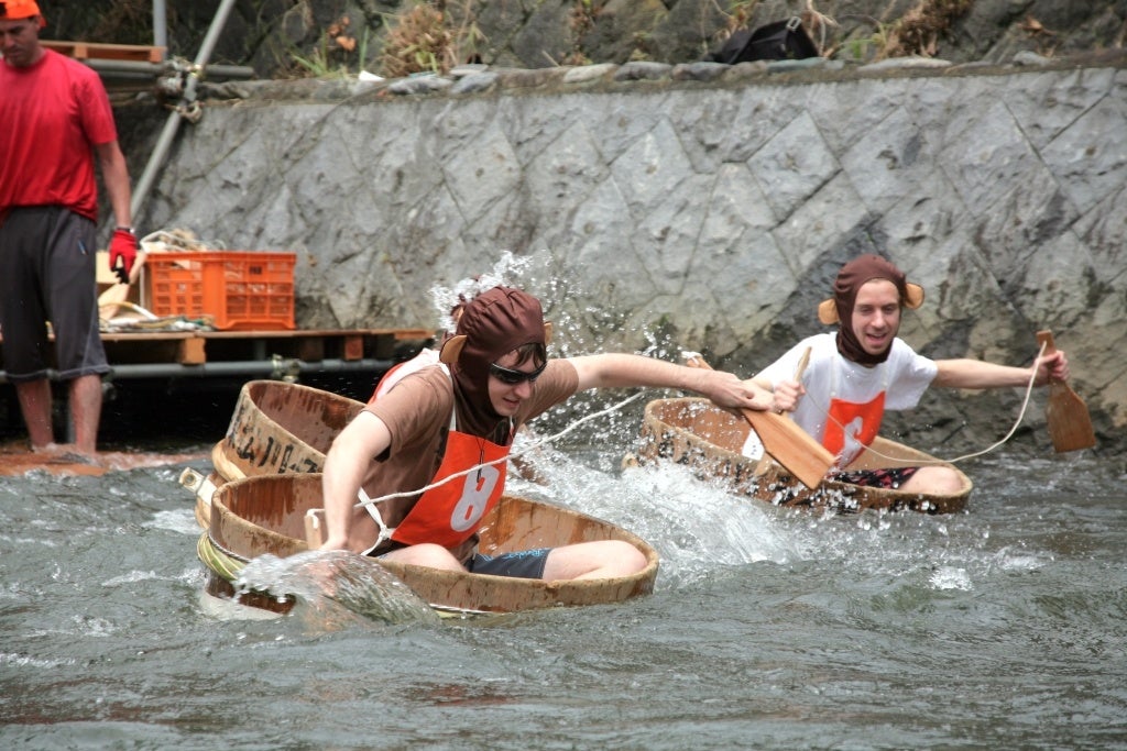 タライ乗り競走とは、1956年から続いている、温泉街の中心に流れる松川で行われる夏のイベントの一つです。直径1メートルほどの大きなたらいに乗り、しゃもじのような小さな櫂を漕いで速さを競うユニークな競技です。