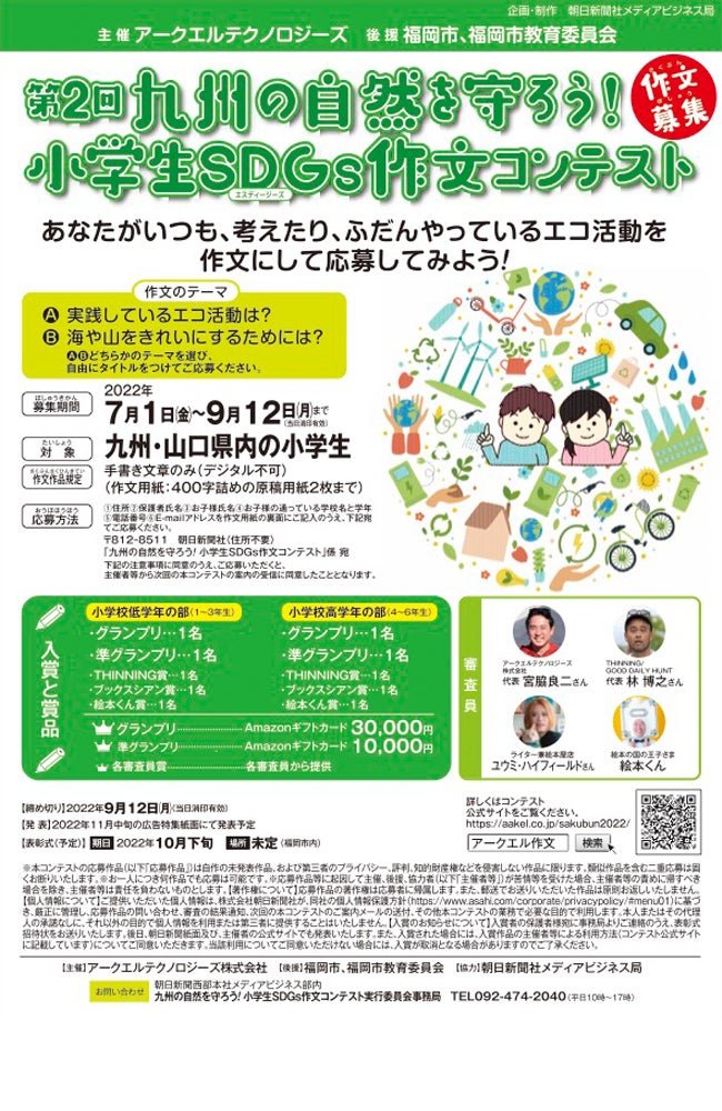 アークエルテクノロジーズ株式会社(本社:福岡県福岡市、代表取締役:宮脇良二、以下「当社」)は「デジタルイノベーションで脱炭素化社会を実現する」を企業目的に掲げ、気候変動問題の解決とビジネスとの両立を目指し、事業展開する福岡発のクライメートテック企業です。 当社は、昨年に続き今年度も地元九州・山口県内の小学生を対象とした「九州の自然を守ろう!小学生SDGs作文コンテスト」を開催いたします。本コンテストは、これから脱炭素化社会の実現を担う小学生たちに自然環境について考える機会を提供したいという想いから、2021年より開催しているものです。昨年は、200人を超える小学生が多数参加しました。2022年度は、7月1日(金)から「実践しているエコ活動は?」「海や山をきれいにするためには?」の2つのテーマで作文募集を開始いたします。