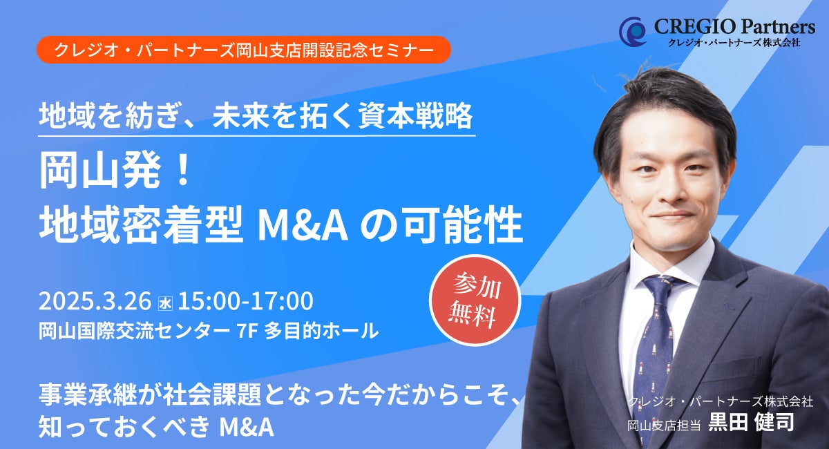 セミナーでは、岡山地域をはじめとする地域経済の実情に即したM&A・事業承継の動向を、実際の事例を交えながら解説し、地域の資本政策を支援してきたクレジオ・パートナーズだからこそ語れる、成功のポイントや課題、今後の展望をお伝えします。ぜひご参加ください。チラシはこちら。
