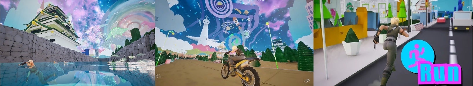 「OSAKA CASTLE SPEED TRIATHLON」は、大阪の実際の街とリアルイベントから誕生したコンテンツを元に構築しています。関西初のゲーミングワンルームを有するマンション「リンクス大阪城EASTレジデンス(※1)」を忠実に再現したマップや、今年で6度目の開催が実現した「大阪城トライアスロン(※2)」をバーチャル体験できるマップ、昨年開催し約2万人が来場した子ども向け職業体験イベント「みらいのたからばこ(※3)」で子供たちが作り上げたペーパーハウスの町や、など、リアルとバーチャルが融合したユニークな体験を提供します。