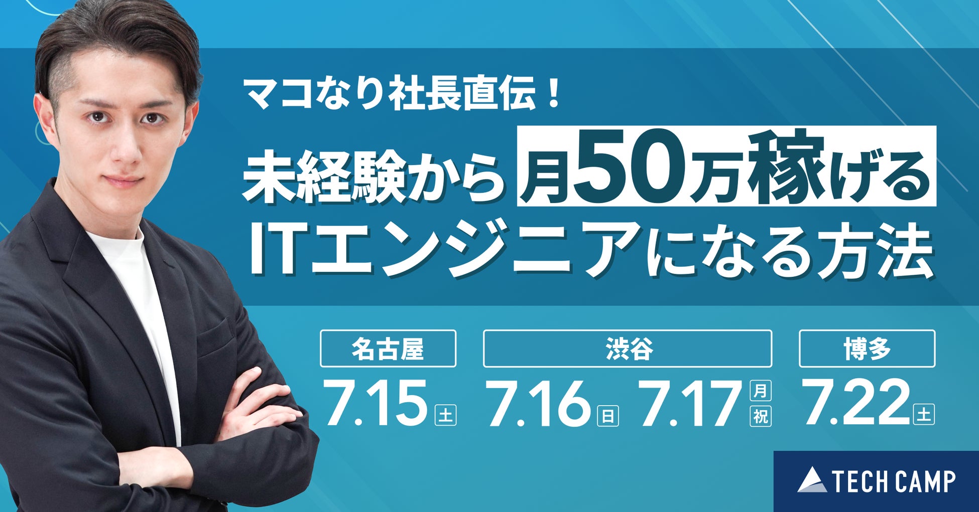 テックキャンプ、“マコなり社長”登壇の特別セミナー「未経験から月50万稼げるITエンジニアになる方法」を東京・愛知・福岡で開催【参加費無料】