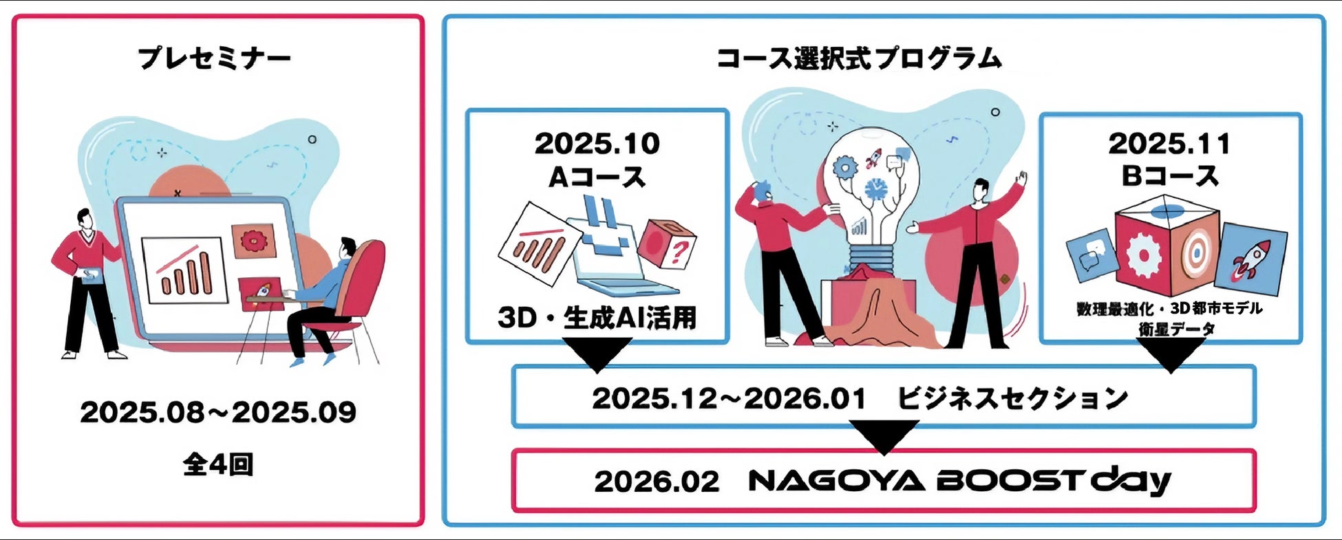 その集大成として開催する「NAGOYA BOOST day」は、次世代イノベーターが成果をピッチで発表し、協業・事業マッチング・投資・採用/参画など“次の一手”につなげる出会いの場です。