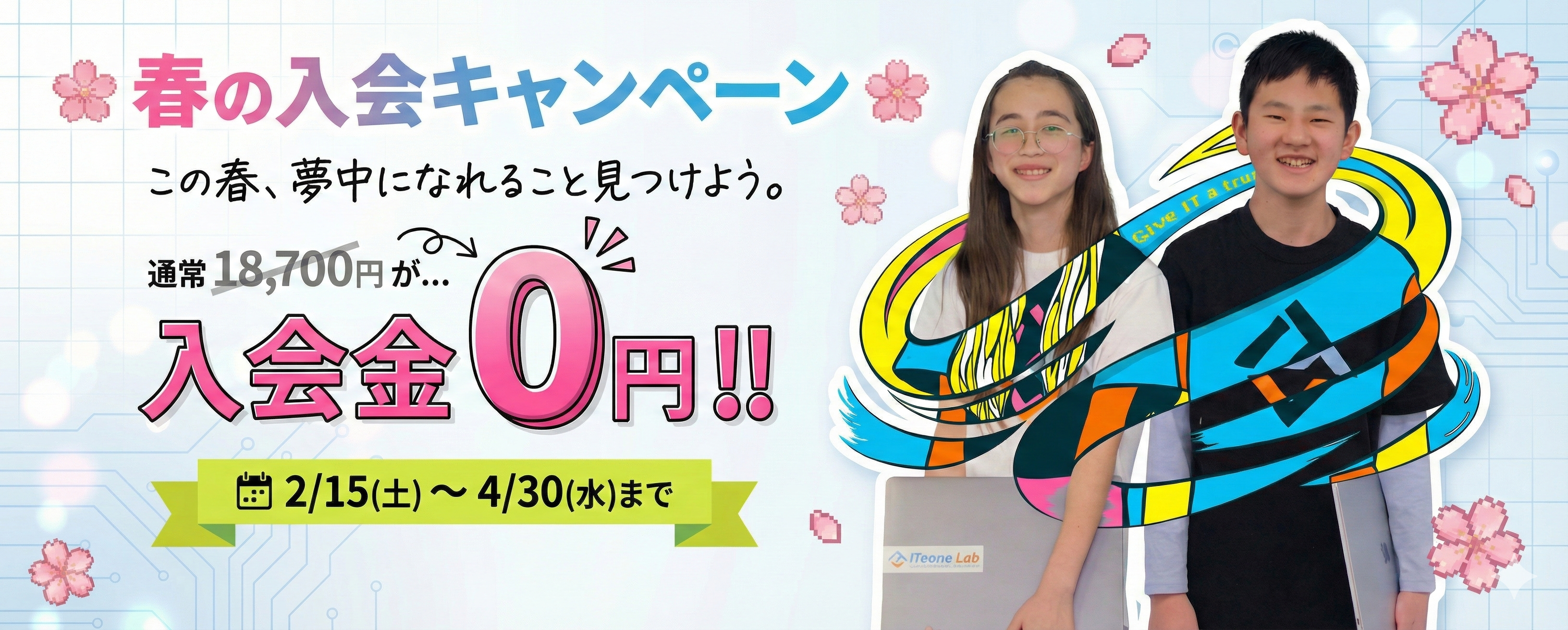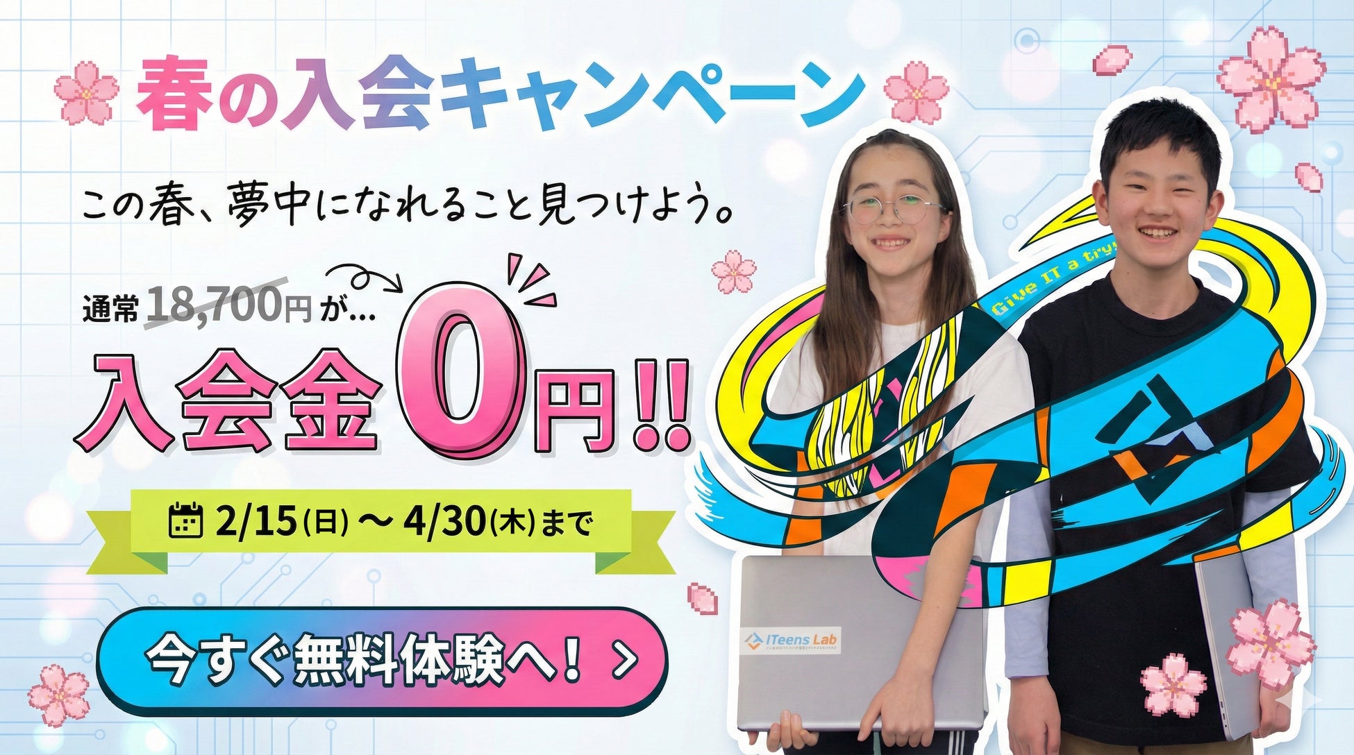 小中高生向けオンラインITスクール「ITeens Lab(アイティーンズラボ)」は、2026年2月15日(日)から4月30日(木)までの期間、「春の入会キャンペーン」を実施します。期間中にお申し込みいただいた方を対象に、通常18,700円(税込)の入会金を0円とし、新年度に向けた学びのスタートを後押しします。