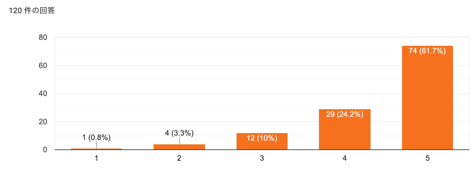 定期的に満足度アンケートを実施し、授業・サポート改善に活用。直近のアンケート(回答120件)では、満足度「5」(最高)が61.7%、「4」が24.2%で、4〜5が85.8%、平均4.43/5となりました。(2025年11月実施)