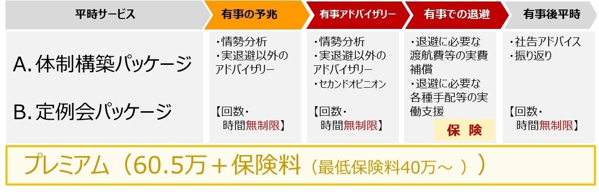 本サービスでは、平時には海外危機管理体制の基礎作りをご支援、予兆時から有事、有事後平時にはアドバイザリーサービス、有事には退避に必要な渡航費等の実費補償と各種手配等の実働支援が含まれています。有事の実費補償と実働支援は、損保ジャパンの海外非常事態対応費用保険により補償されます。