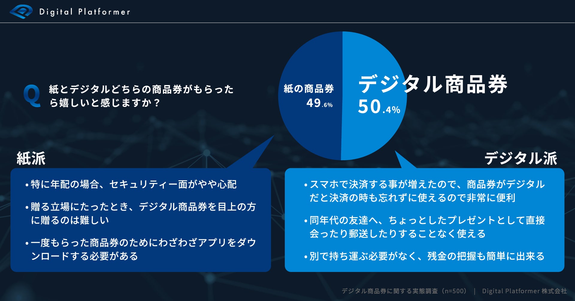 デジタル商品券派では決済の利便性や、プレゼントの手軽さがといった理由が多く見受けられたのに対して、紙の商品券派はアプリでの利用手続きの不便さ、セキュリティ面の懸念、また目上の方への贈りやすさという観点から紙の商品券を選ぶ傾向が見られました。