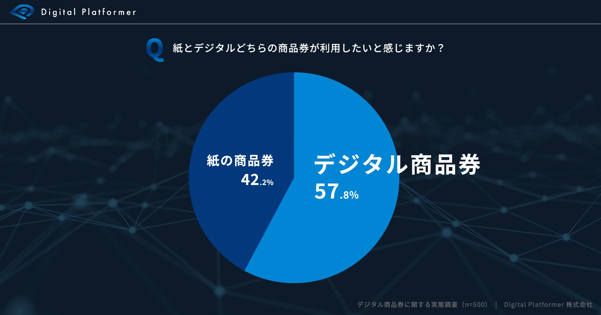 20代~60代の全国の男女 500名を対象としたアンケート調査の結果、直近1年間の商品券利用率を紙とデジタルそれぞれで集計したところ、紙の商品券の利用率は61% デジタル商品券の利用率は51.8%となり、紙の商品券の利用率がデジタル商品券の利用率を上回りました。また「紙とデジタル商品券のどちらを利用したいか」との問いには「デジタル商品券」との回答が57.8%となり、過半数を上回りました。