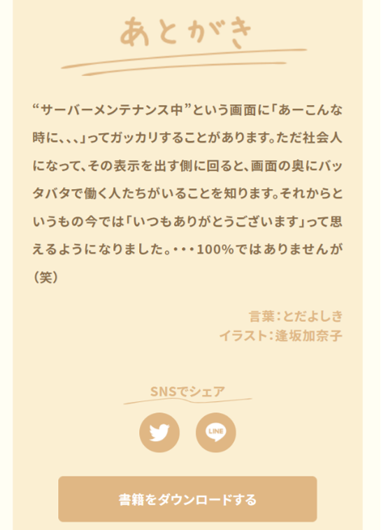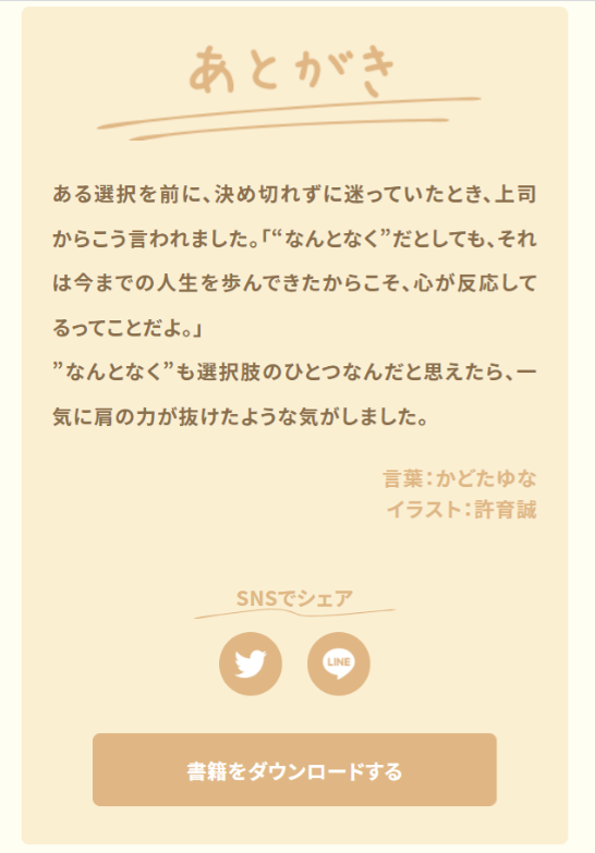 また、サイトオープンに合わせて、公式Twitterも開設しました。タイムライン上でも目に止まりやすいイラストを、やさしい言葉と共に定期的に発信していくことで、広く遠くまで届け、偶発的な出会いも作っていきたいと考えています。