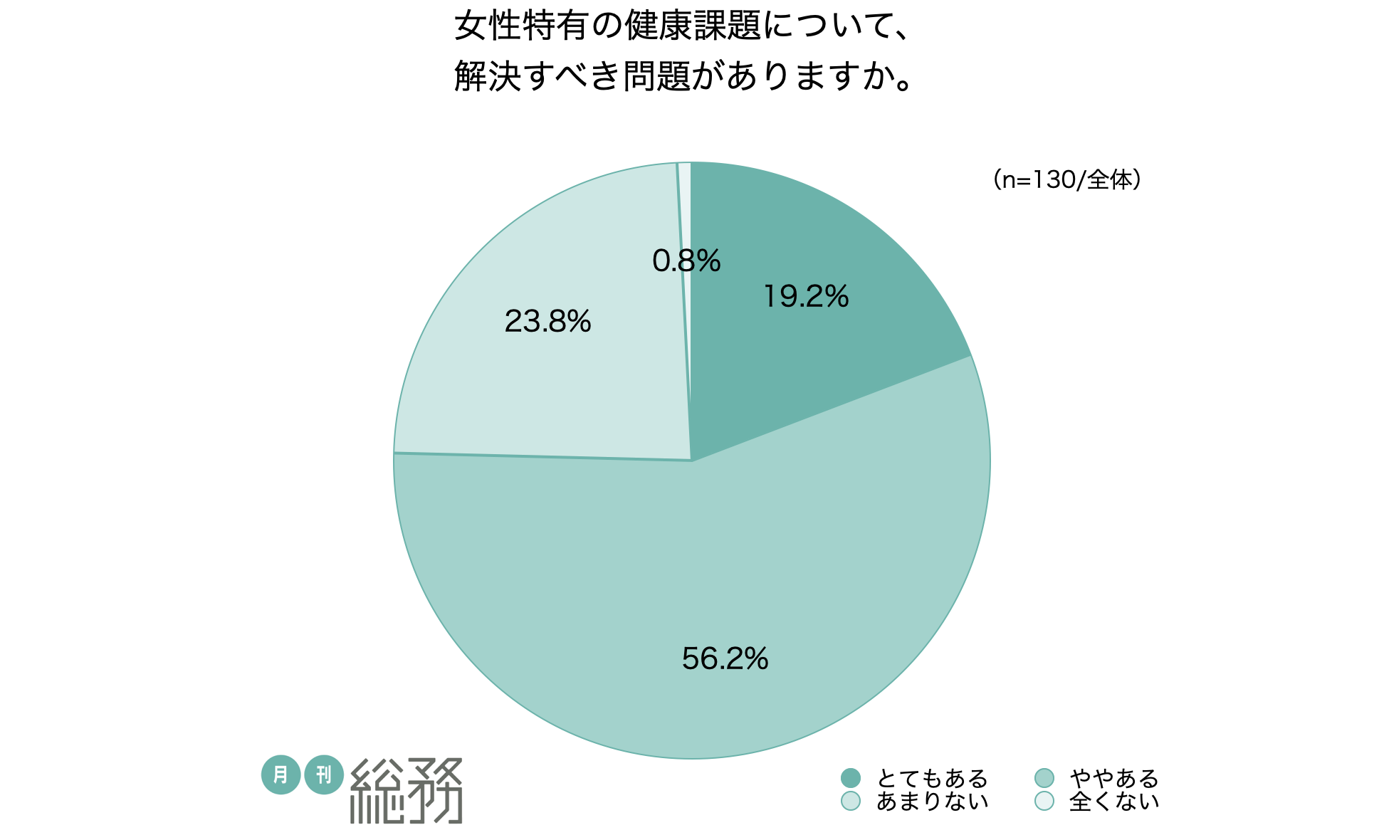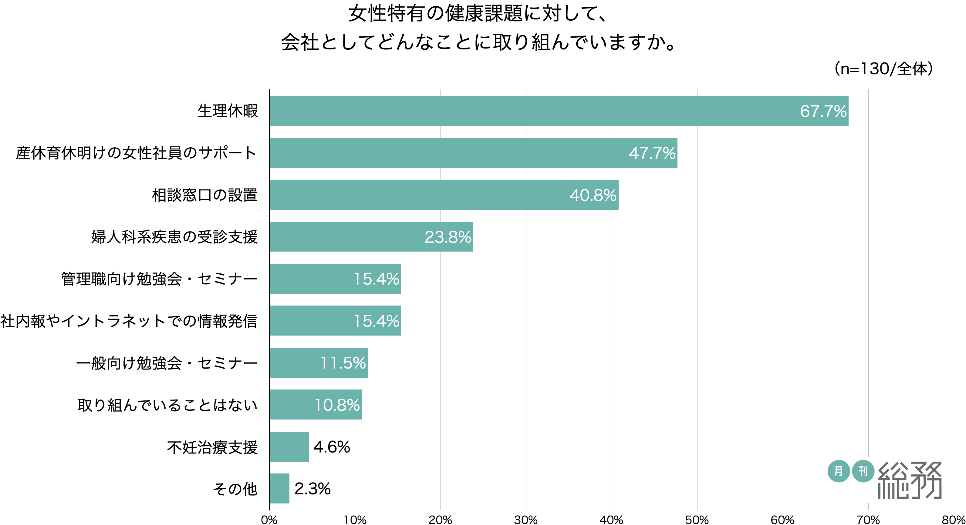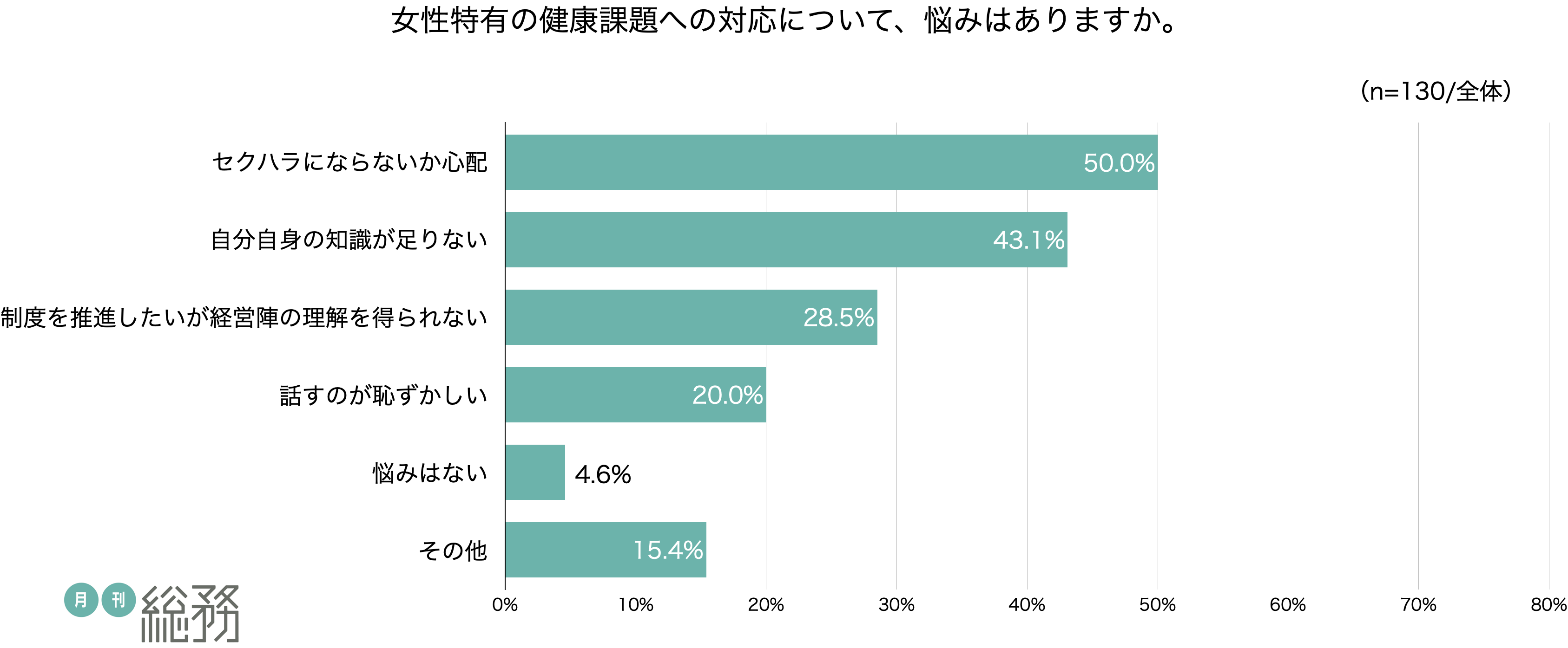 日本で唯一の総務専門誌『月刊総務』を発行する株式会社月刊総務(所在地:東京都千代田区、代表取締役:豊田健一)は、全国の総務担当者を対象に女性特有の健康課題に関する調査を実施し、130名から回答を得ました。