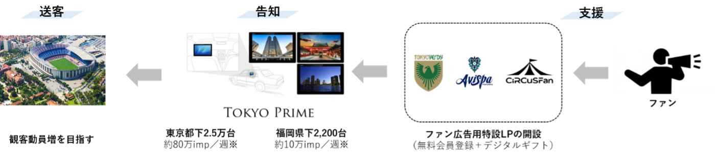 本実証実験は、ファンが応援するチームの主催試合を盛り上げるための「観客動員」を目的とし、サーカスが提供するクラウドファンディングのCiRCuSFan(以下「サーカスファン」)を用いて広告出稿を目指す、「ファンが育てる」応援広告のプログラムです。