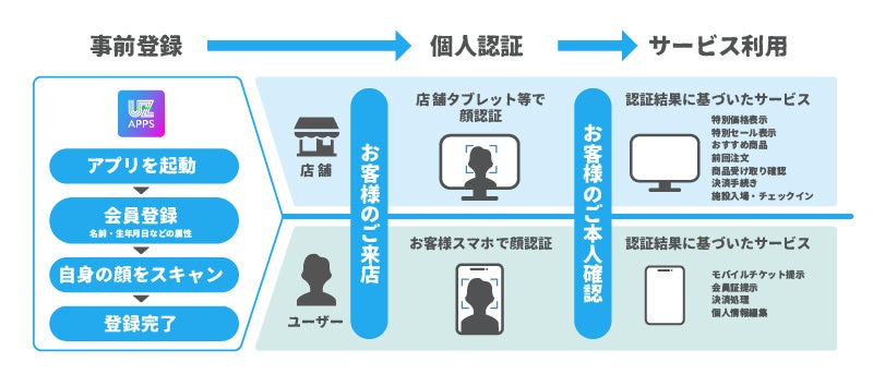 顧客は事前にスマートフォンを用いて会員情報など、事業会社様の求める情報を顔データと共に登録します。その後、店舗等をお客様が訪れた際には“専用のアプリ端末カメラ”を用いた本人認証もしくは店舗に設置した“専用カメラ”による本人認証を行います。これにより個人情報を確認する証明書を顧客に要求する事なく本人確認を終了する事ができ、事業会社様にとっても顧客にとってもシームレスでストレスフリーなサービスが創造できます。