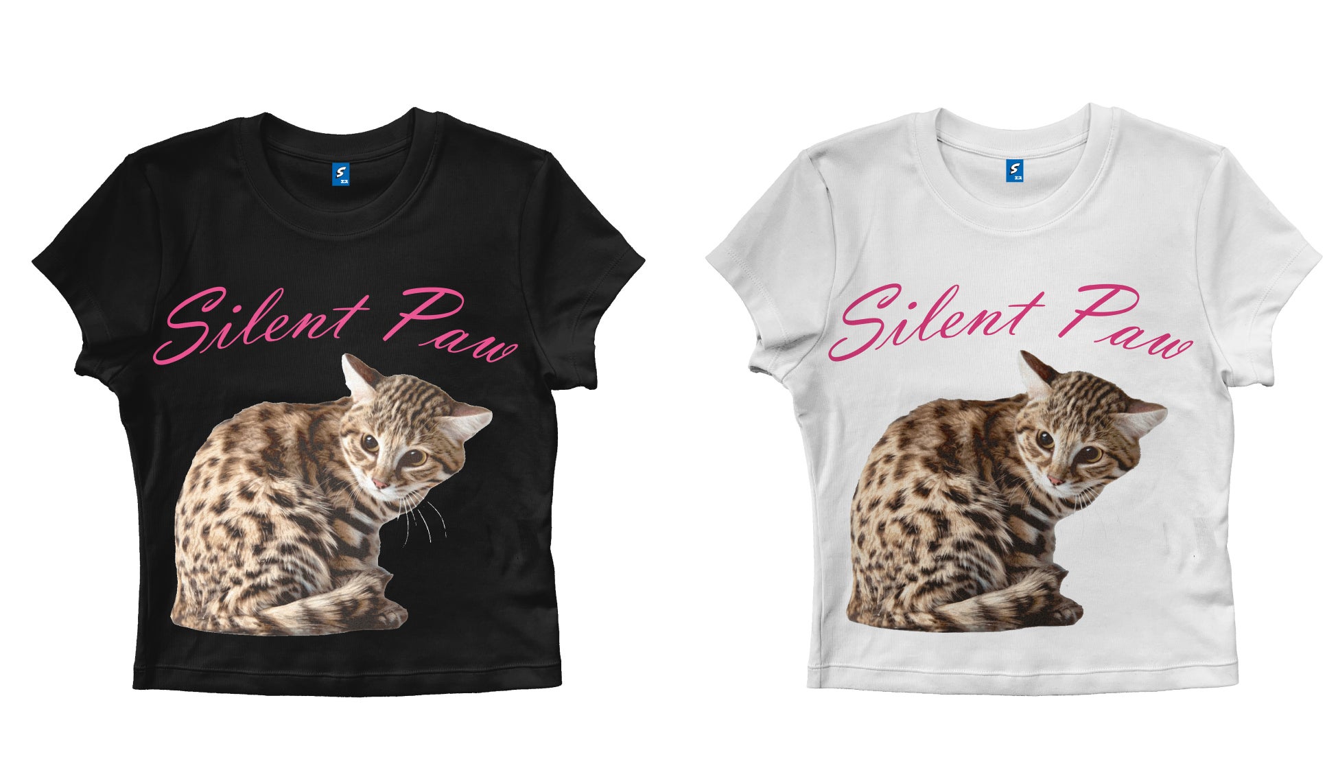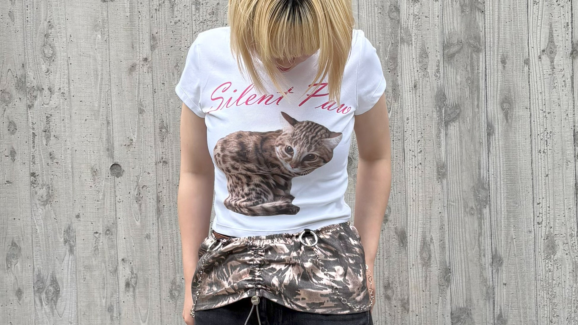 上目遣いで甘えている、何とも言えないクロアシネコの表情がなんとも愛らしい。着丈はチビT。