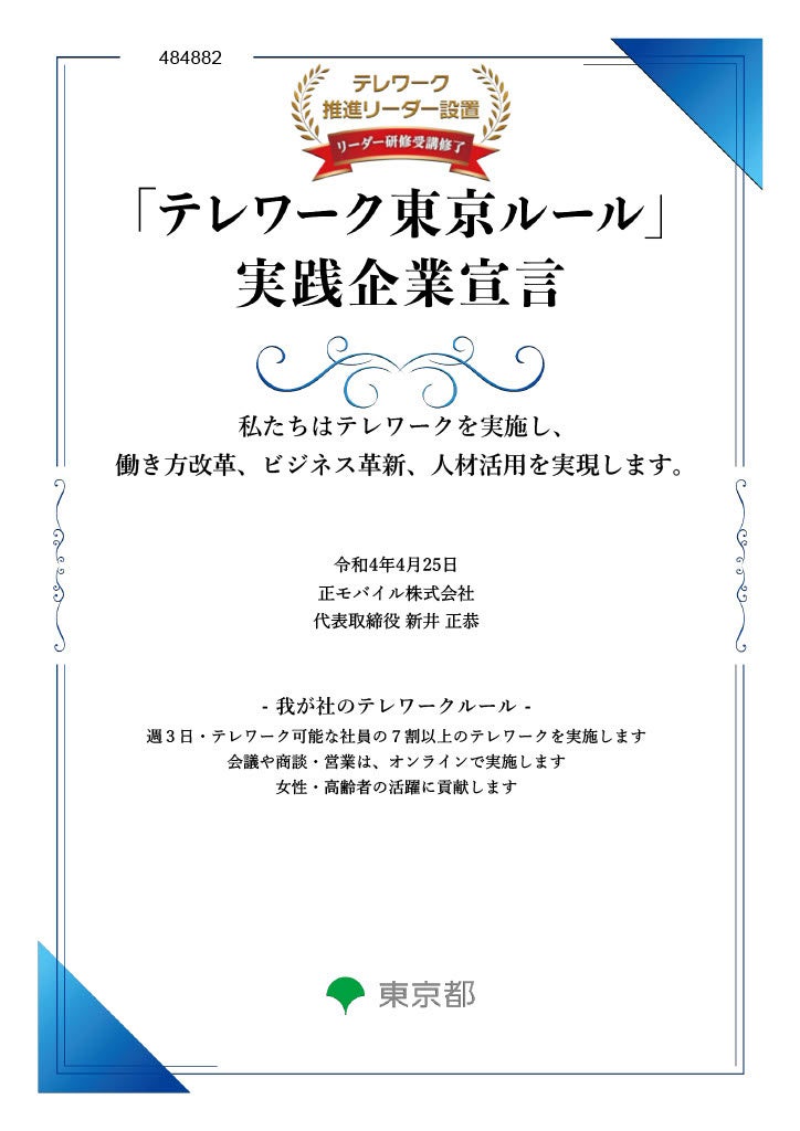 正モバイル株式会社(本社:東京都中央区、代表取締役:新井正恭)は、このたび東京都が提唱する「テレワーク東京ルール」実践企業に認定されたことをお知らせいたします。